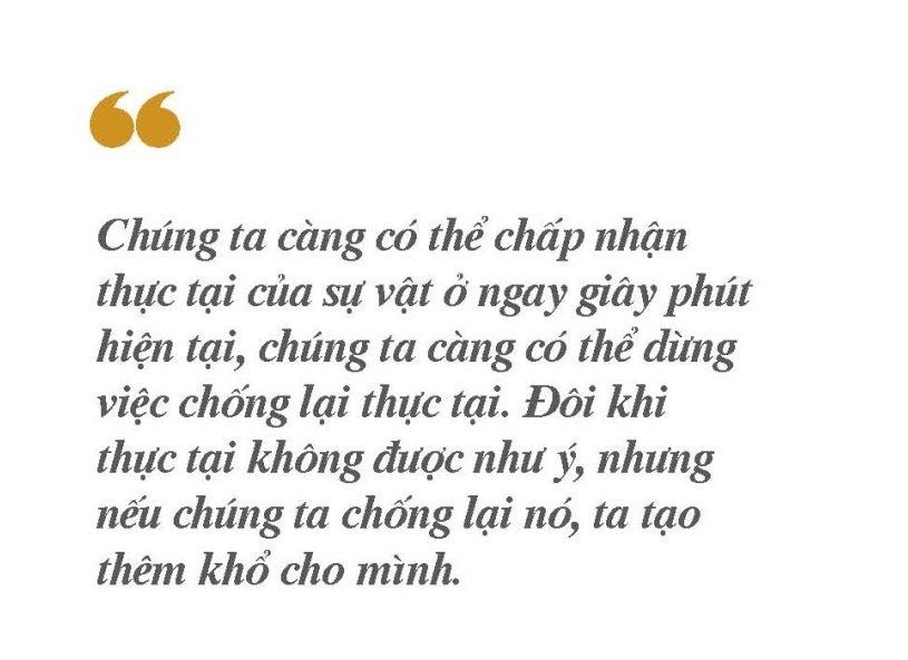 Chúng ta càng có thể chấp nhận thực tại của sự vật ở ngay giây phút hiện tại, chúng ta càng có thể dừng việc chống lại thực tại. Đôi khi thực tại không được như ý, nhưng nếu chúng ta chống lại nó, ta tạo thêm khổ cho mình. Than khóc rằng, “Mẹ tôi không được bệnh” không giúp bà khỏi bệnh. Nhưng khi bạn chấp nhận căn bệnh của mẹ, tâm bạn sẽ bình ổn hơn và do đó có thể đáp ứng các nhu cầu của bà.