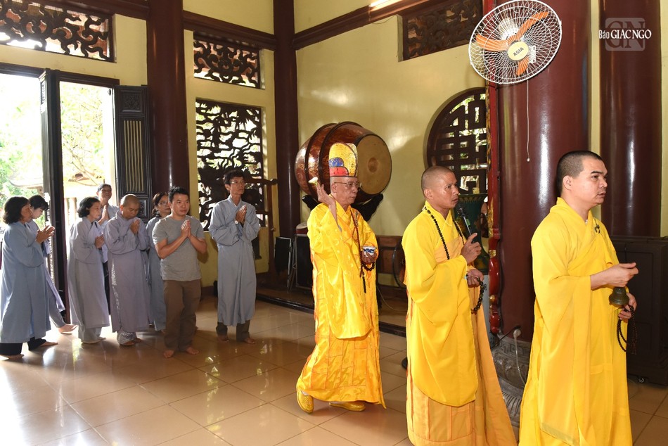Trong không khí tôn nghiêm, thanh tịnh, chư vị giáo phẩm đã niêm hương, đảnh lễ Tam bảo; Hòa thượng Thích Huệ Chúc cử hành nghi thức sái tịnh, cung thỉnh an vị tôn tượng Đức Phật Bổn Sư theo truyền thống cố đô Huế.