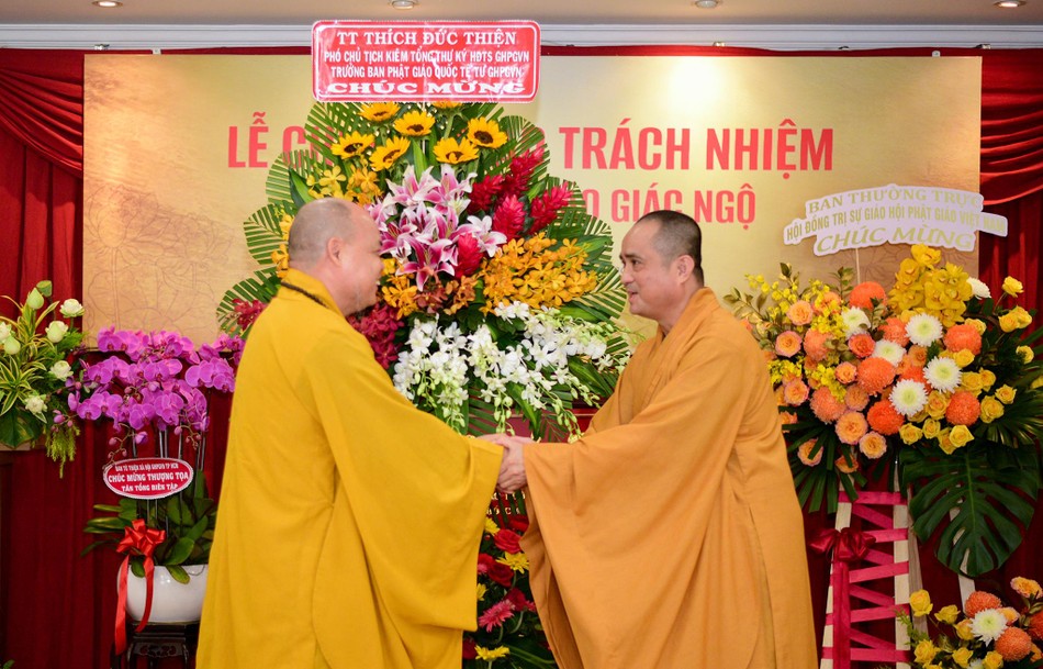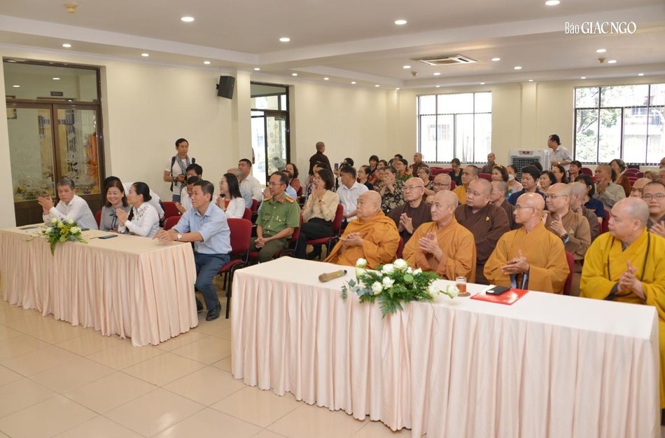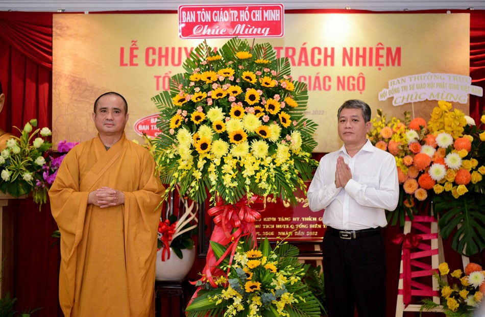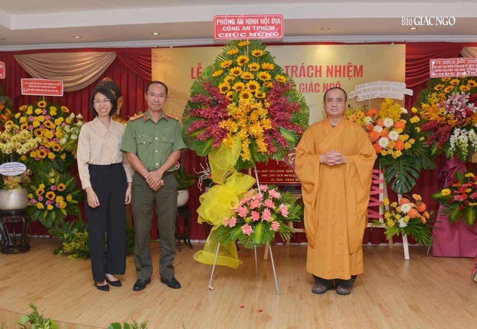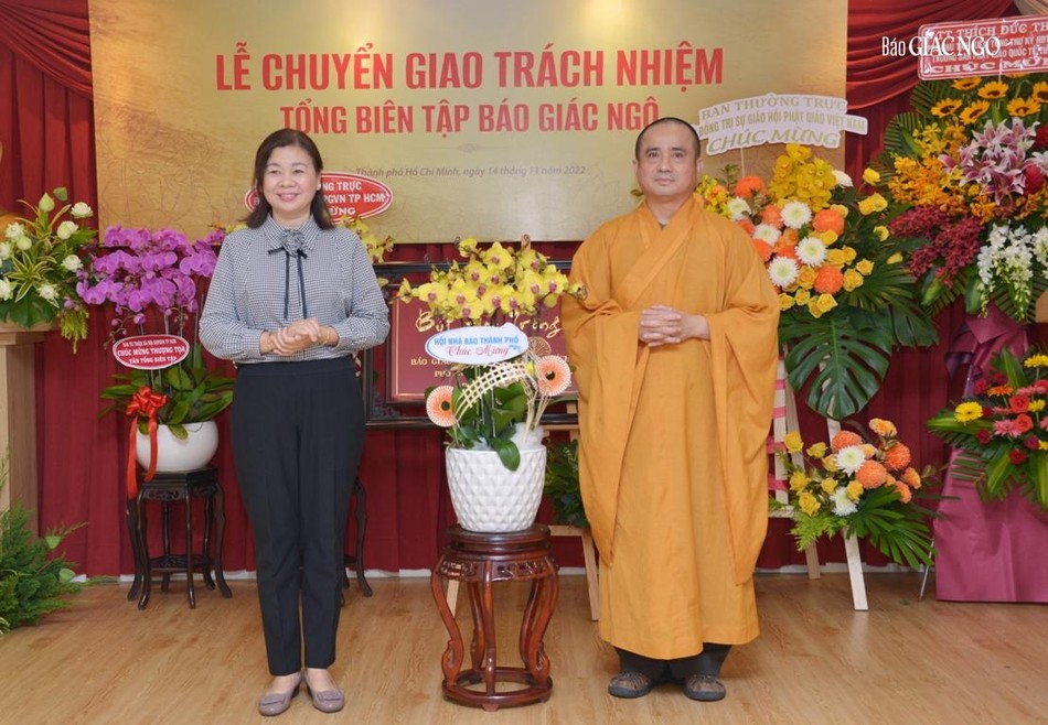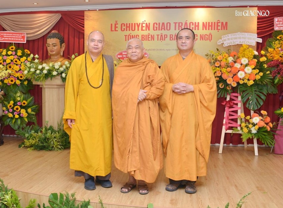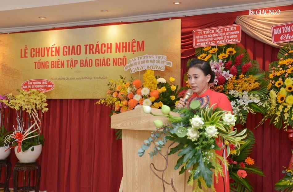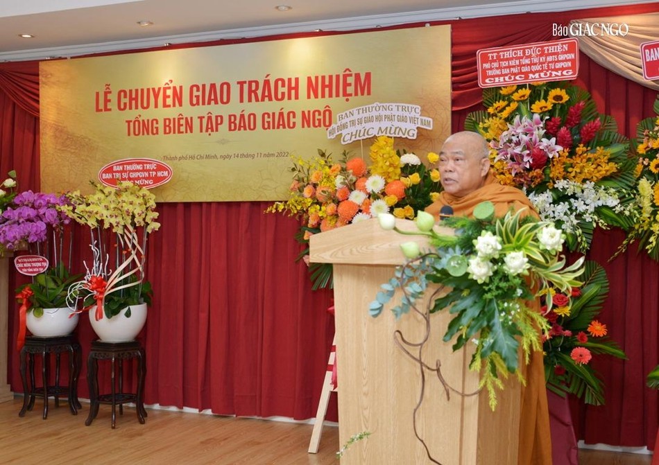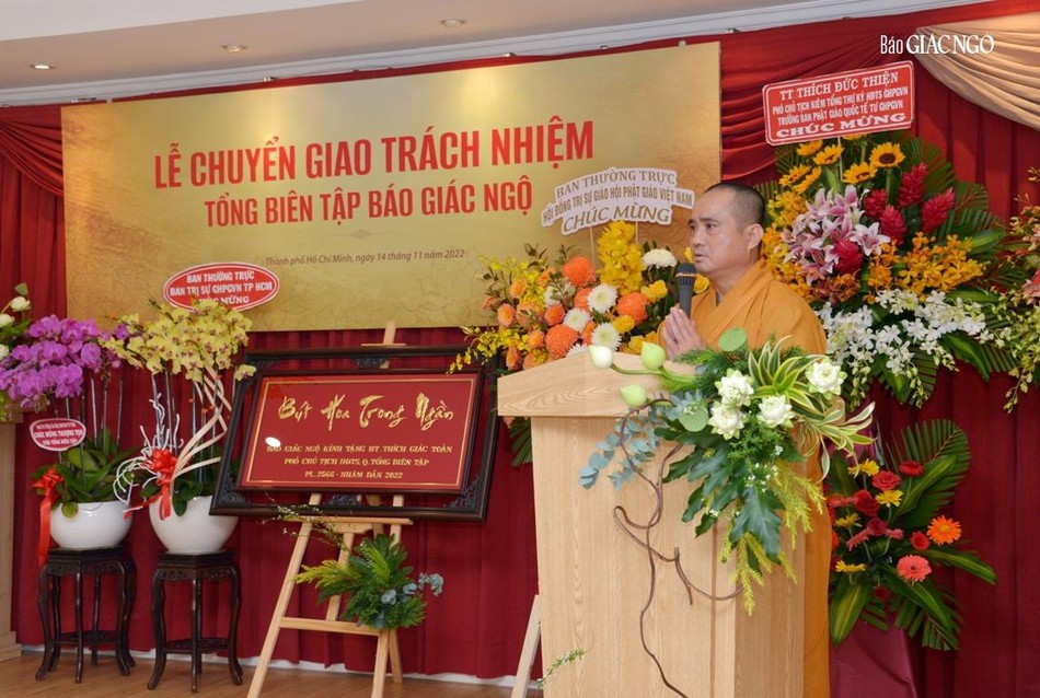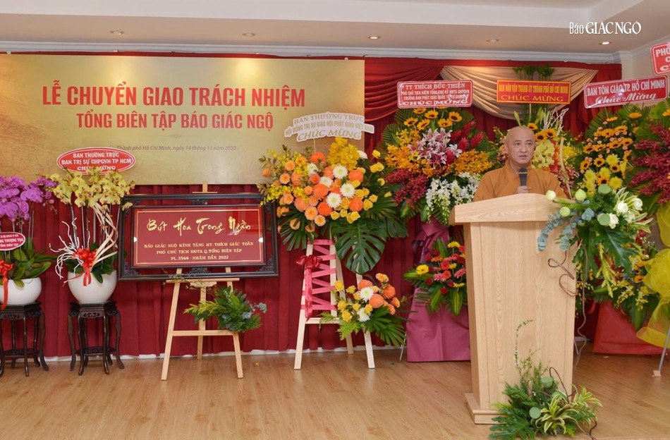 Hòa thượng cũng đại diện Ban Tổ chức tri ân đến chư tôn đức Ban Thường trực Hội đồng Trị sự GHPGVN, Ban Trị sự GHPGVN TP.HCM, đại diện lãnh đạo Thành ủy, các cơ quan, sở, ngành TP.HCM hiện diện trong buổi chuyển giao trách nhiệm Tổng Biên tập báo Giác Ngộ.
