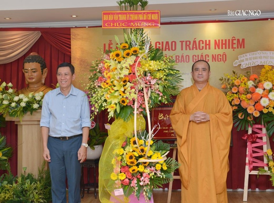 Dịp này, Thượng tọa Thích Thiện Quý đại diện Hòa thượng Thích Lệ Trang và Ban Thường trực Ban Trị sự GHPGVN TP.HCM chúc mừng đến Thượng tọa Thích Tâm Hải được Đức Quyền Pháp chủ GHPGVN tin tưởng giao trách nhiệm kế thừa vai trò lãnh đạo báo Giác Ngộ trong giai đoạn hiện nay.