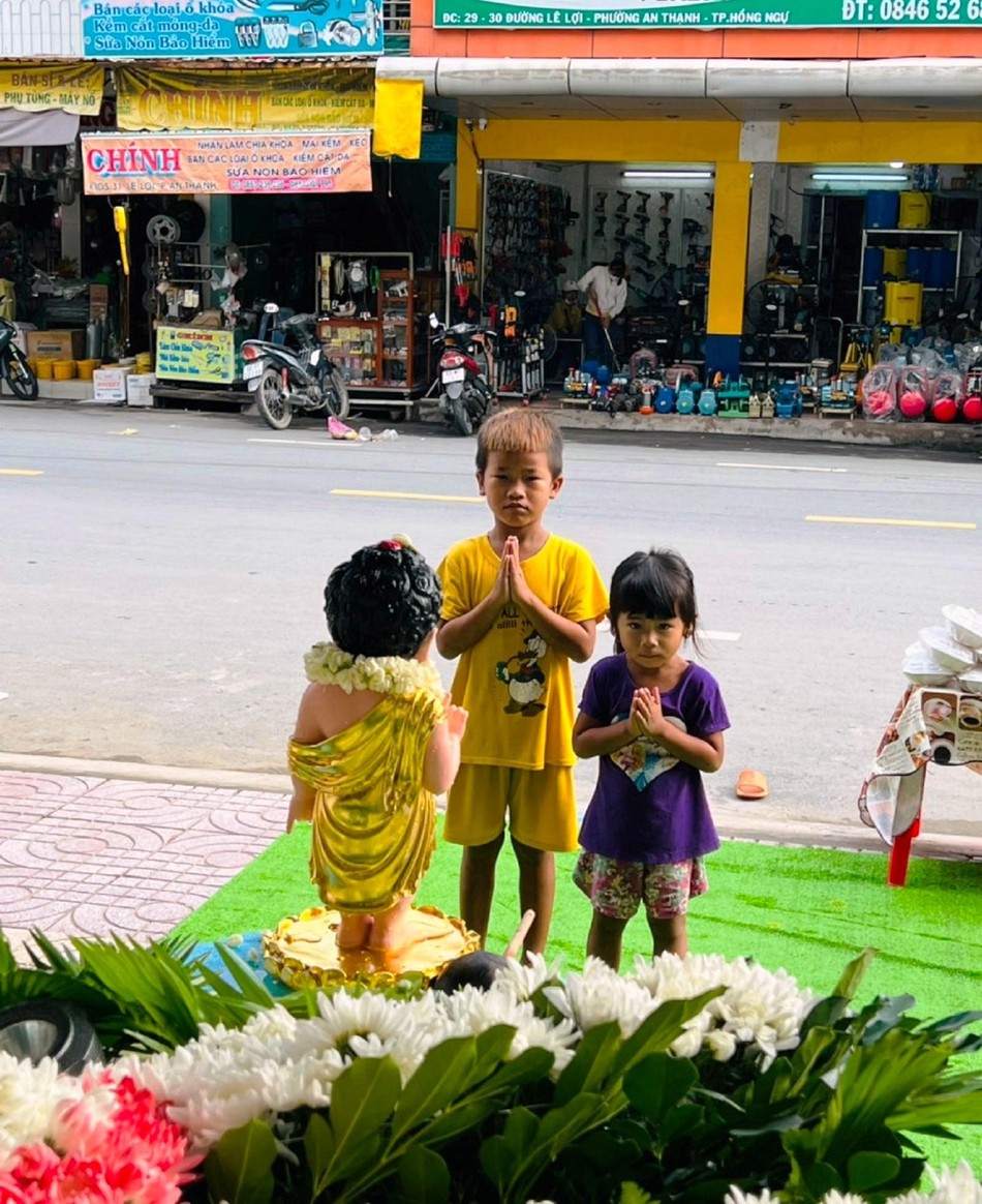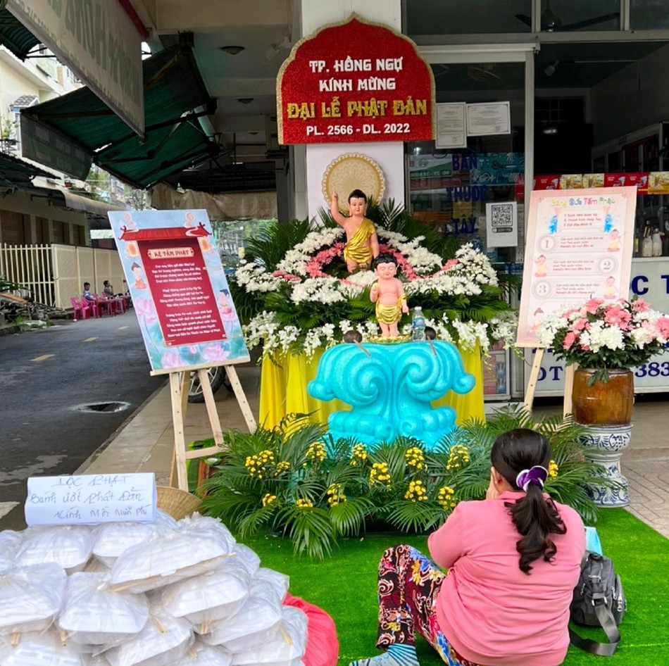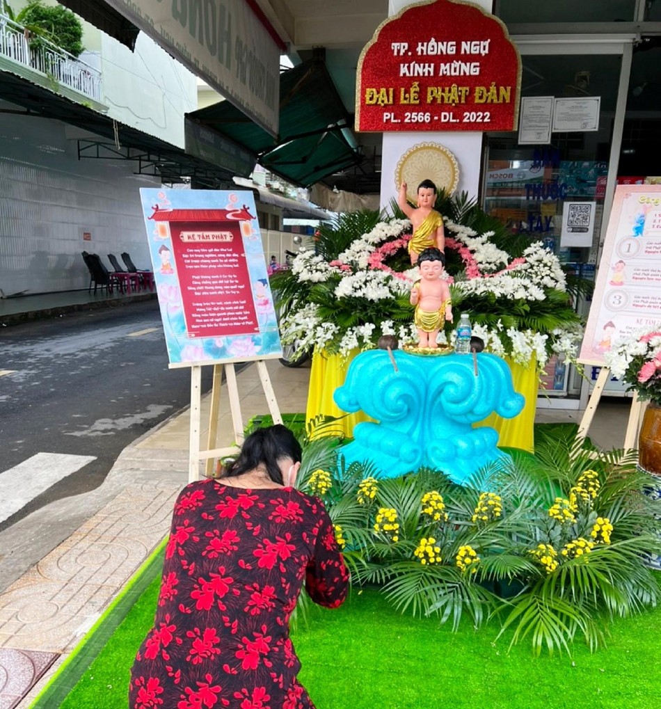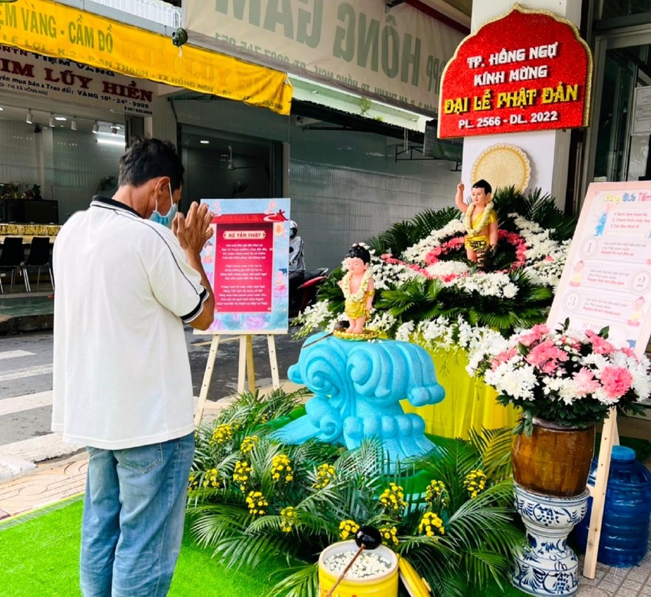 GNO - Những năm gần đây, ở góc chợ Hồng Ngự ở tỉnh Đồng Tháp, lễ đài Phật đản đã được một số bà con thiết trí tượng Phật sơ sinh, để mọi người qua lại có thể tùy nghi cử hành Tắm Phật, cầu nguyện trong mùa Phật đản.