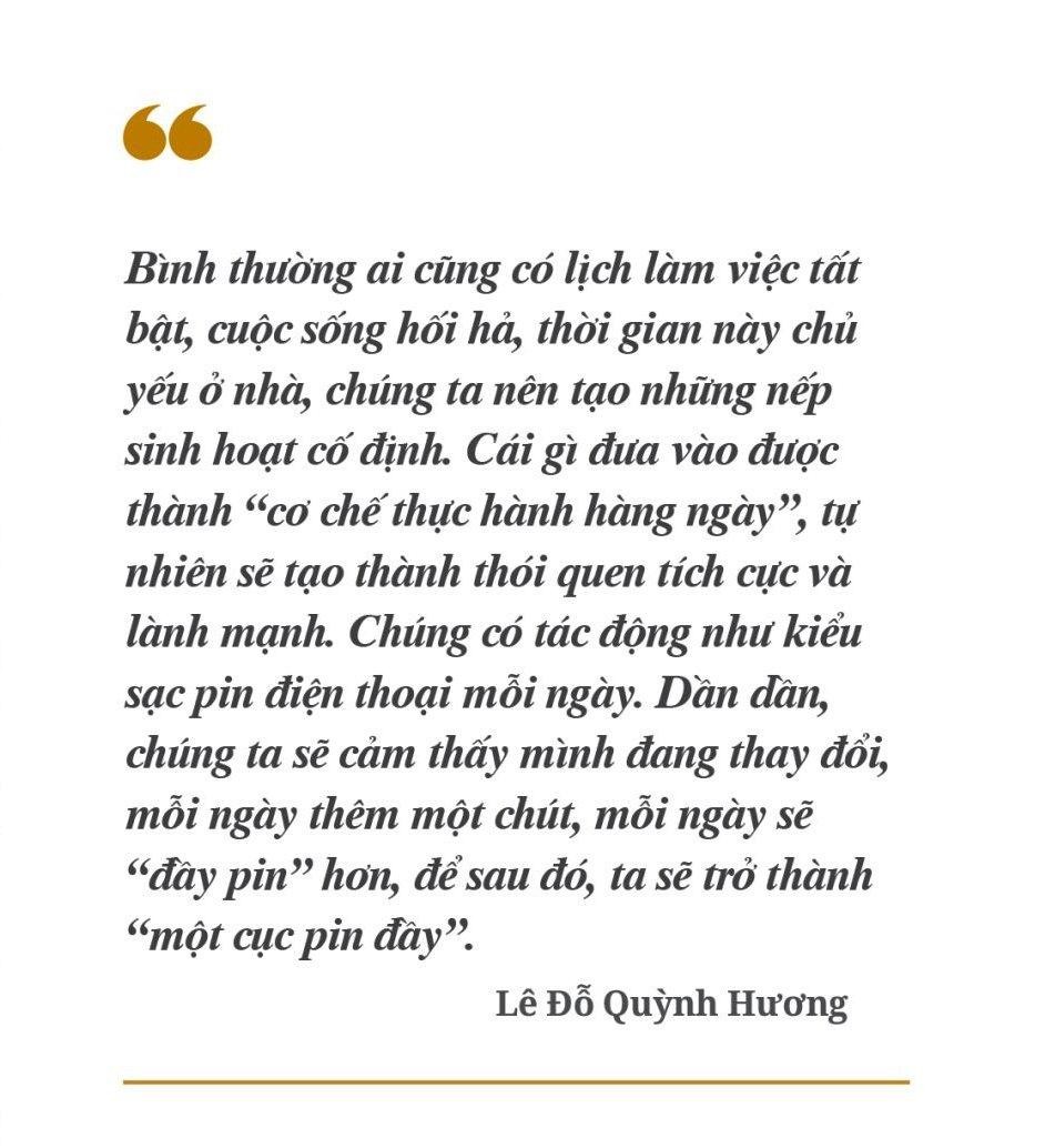Bình thường ai cũng có lịch làm việc tất bật, cuộc sống hối hả, thời gian này chủ yếu ở nhà, chúng ta nên tạo những nếp sinh hoạt cố định. Cái gì đưa vào được thành “cơ chế thực hành hàng ngày”, tự nhiên sẽ tạo thành thói quen tích cực và lành mạnh. Chúng có tác động như kiểu sạc pin điện thoại mỗi ngày. Dần dần, chúng ta sẽ cảm thấy mình đang thay đổi, mỗi ngày thêm một chút, mỗi ngày sẽ “đầy pin” hơn, để sau đó, ta sẽ trở thành “một cục pin đầy”.