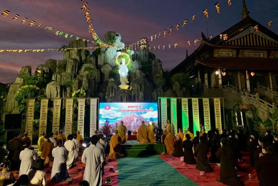 Chư Tăng và Phật tử đã cử hành nghi lễ trước thánh tượng Đức Bồ-tát, thực hành “tam bộ nhất bái” trong khu vườn thiền thuộc khuôn viên chùa.
