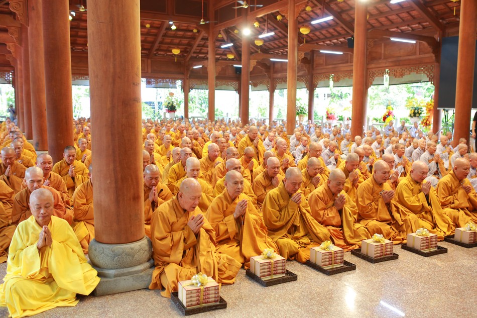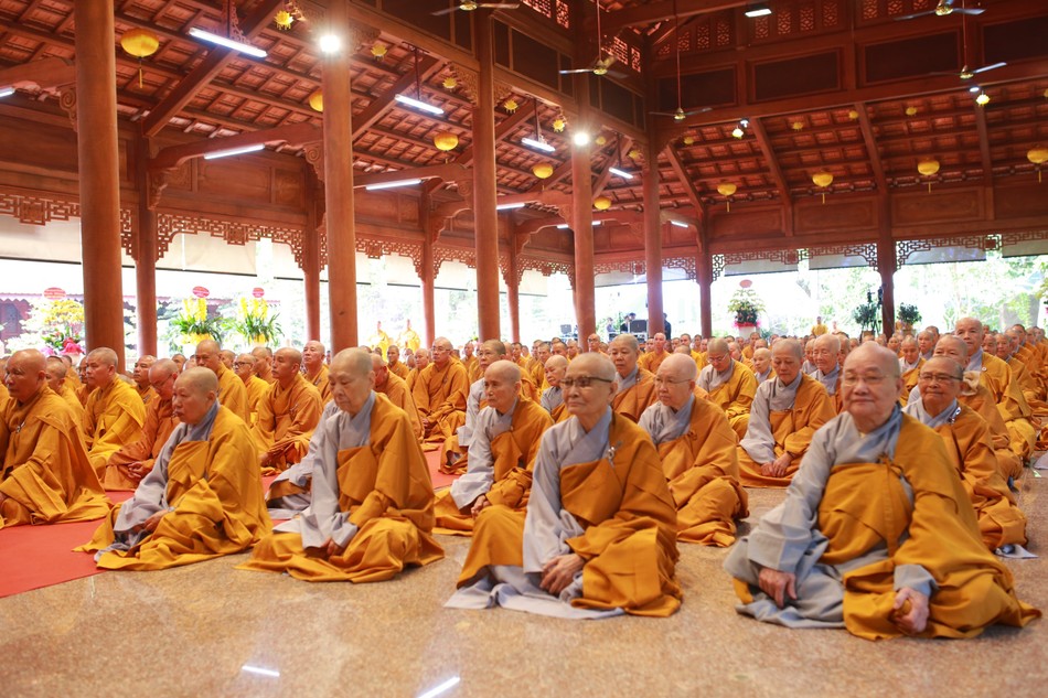 Sau 3 hồi chuông, trống Bát-nhã, hàng nghìn Tăng Ni, Phật tử đã trang nghiêm cung đón Đức Trưởng lão Hòa thượng Thích Thanh Từ quang lâm Thính pháp đường.