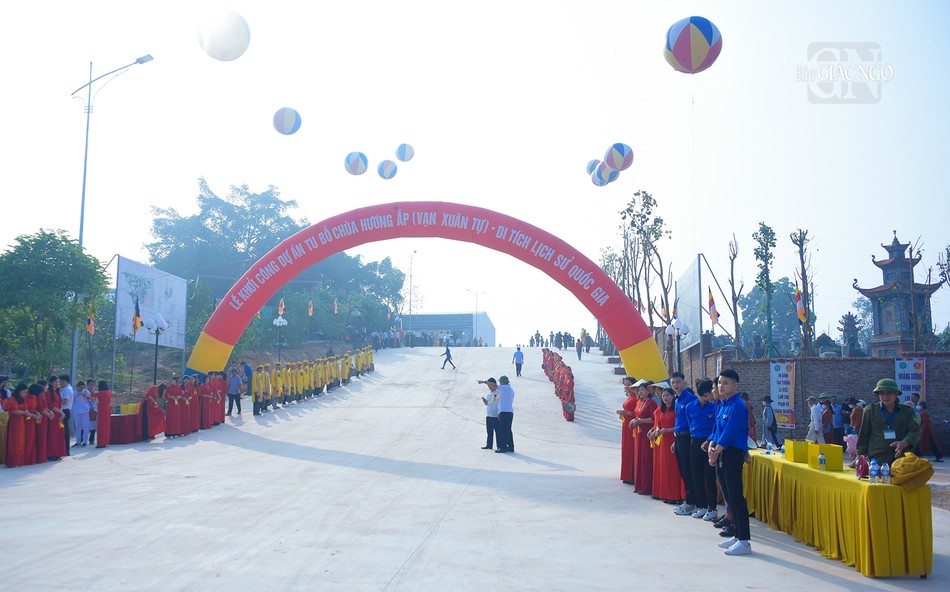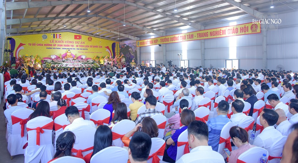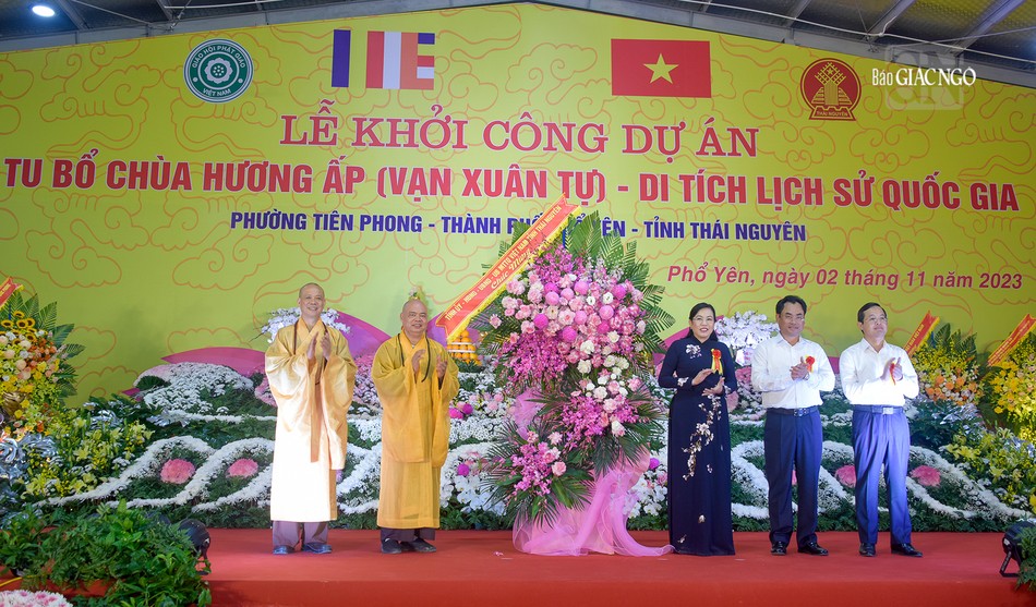 GNO - Sáng nay, 2-11, nhằm ngày vía Đức Bồ-tát Quán Thế Âm (19-9 ÂL), hơn 3.000 Tăng Ni, Phật tử, doanh nhân đã về Thái Nguyên tham dự lễ khởi công "Dự án tu bổ chùa Hương Ấp (Vạn Xuân tự) thuộc Khu di tích Lý Nam Đế" (P.Tiên Phong, TP.Phổ Yên, tỉnh Thái Nguyên).