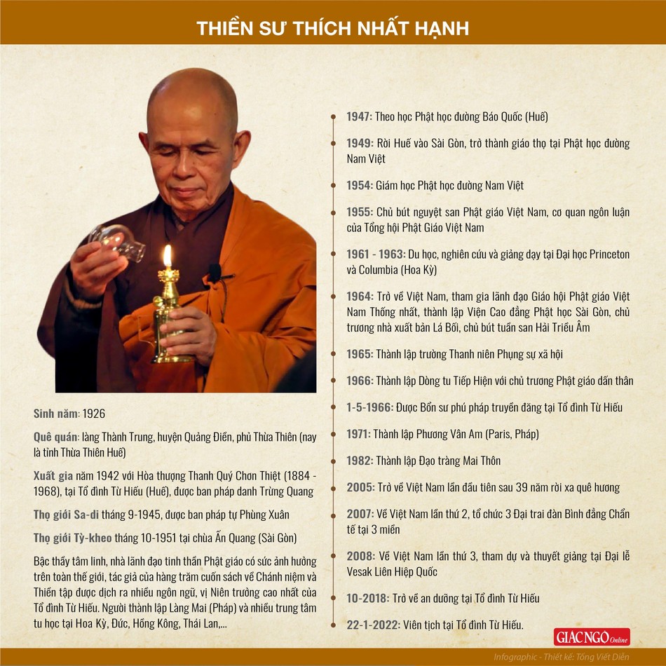 Tang lễ của Thiền sư Thích Nhất Hạnh được cử hành theo di huấn của ngài được các pháp tử thông báo trước đó, miễn các phúng điếu, hoa, quả, trướng liễng… Suốt từ lúc Thiền sư viên tịch cho tới ngày di quan trà-tỳ, đệ tử của Thiền sư ở các trung tâm tu học các quốc gia và vùng lãnh thổ trên thế giới sẽ cùng tham dự một khóa tu theo pháp môn Làng Mai.