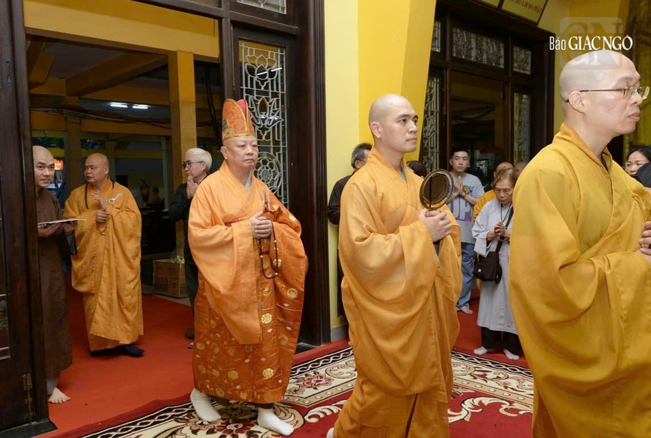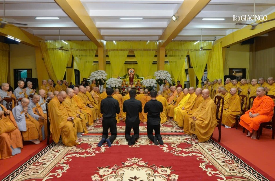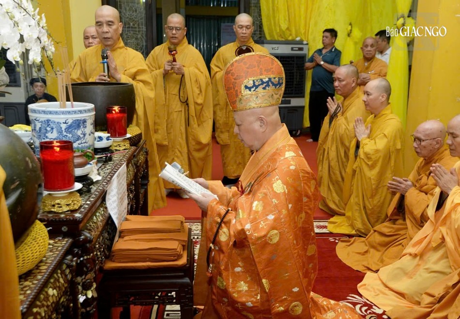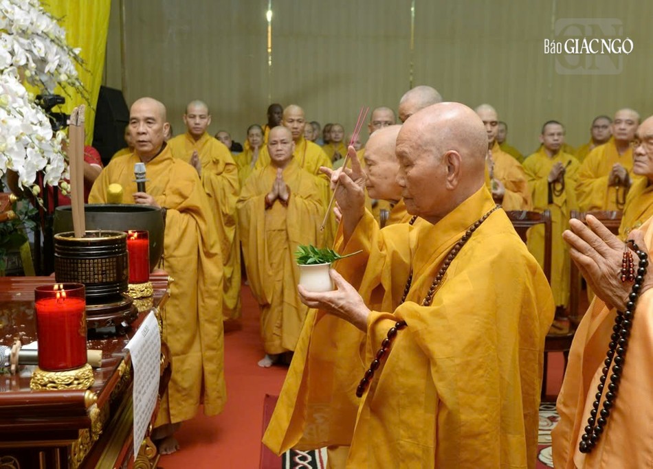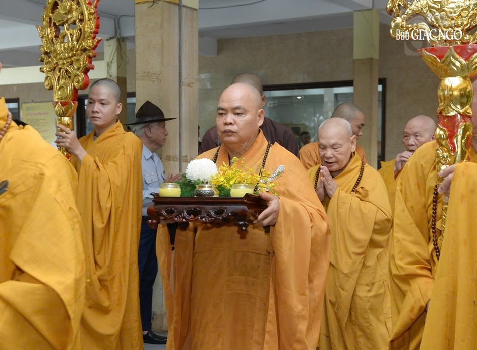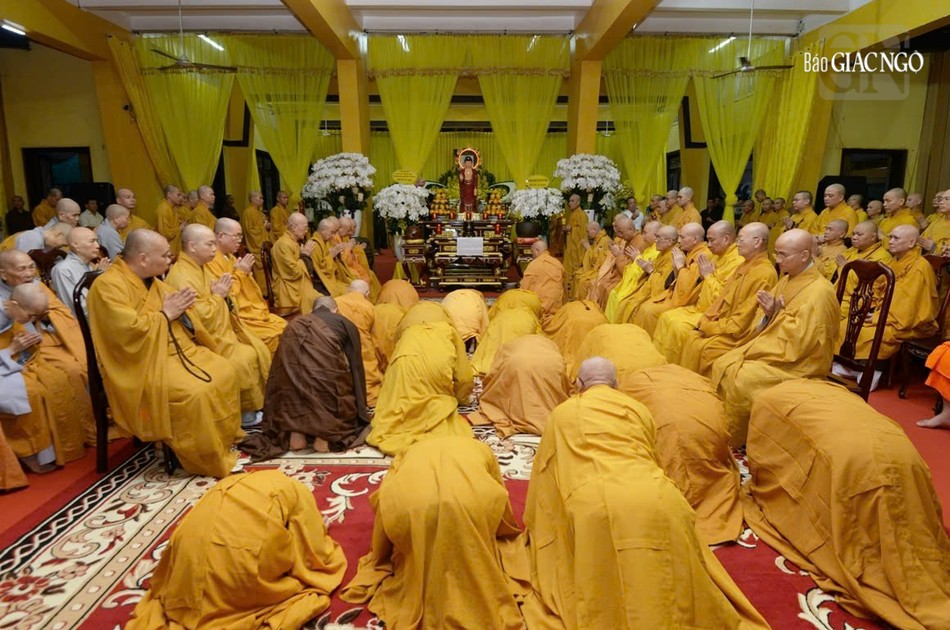 Tiếp đó, Hòa thượng Sám chủ cùng chư tôn đức Ban Kinh sư cử hành khóa lễ thỉnh giác linh Trưởng lão Hòa thượng an vị, môn đồ pháp quyến thọ tang Ân sư theo truyền thống thiền môn.