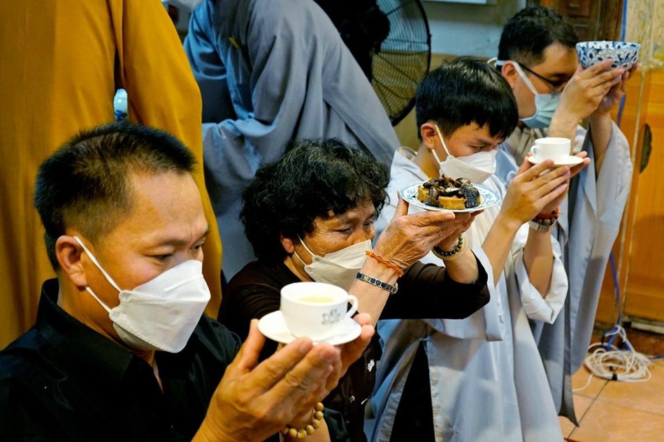 Môn nhân pháp quyến dâng phạn và trà cúng dường ân sư