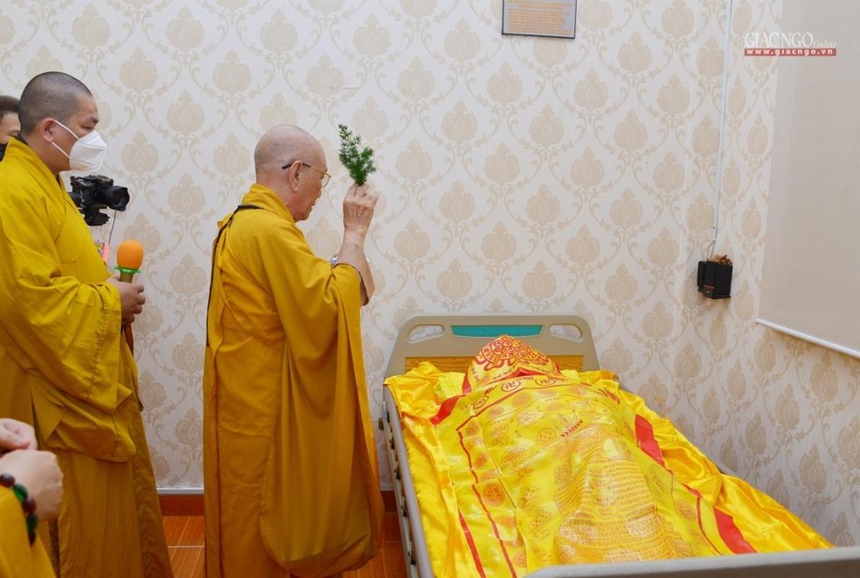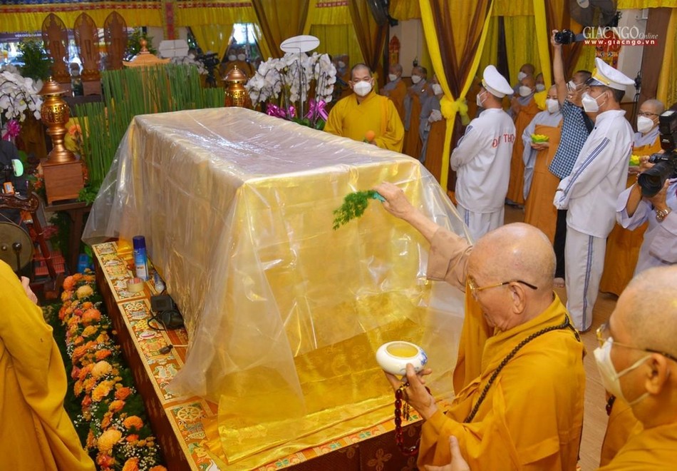 Hòa thượng chứng minh sái tịnh kim quan, cung tuyên pháp ngữ, sau đó chư Ni môn đồ pháp quyến đã thỉnh nhục thể của Ni trưởng tân viên tịch từ thiền thất đến giác linh đường để nhập quan trong sự chứng minh và hộ niệm của chư vị giáo phẩm, Tăng Ni, toàn thể đại chúng.