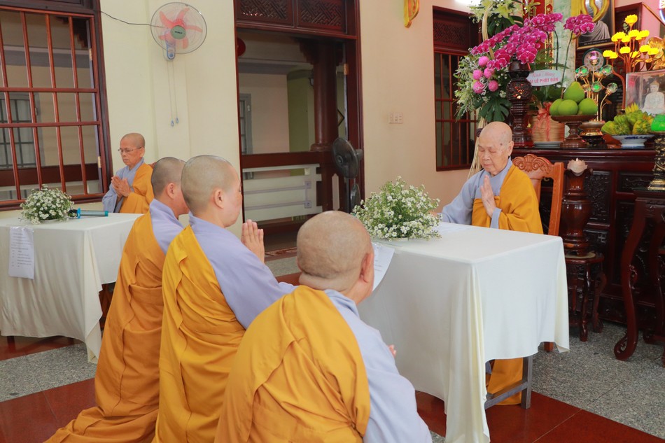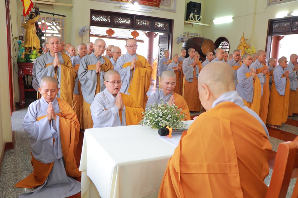 Sáng sớm cùng ngày, đại diện chư Ni đã vân tập về Văn phòng Ban Trị sự - chùa Thiên Minh, đối trước chư tôn đức giáo phẩm tác pháp thỉnh đại Tăng giáo giới thọ an cư.