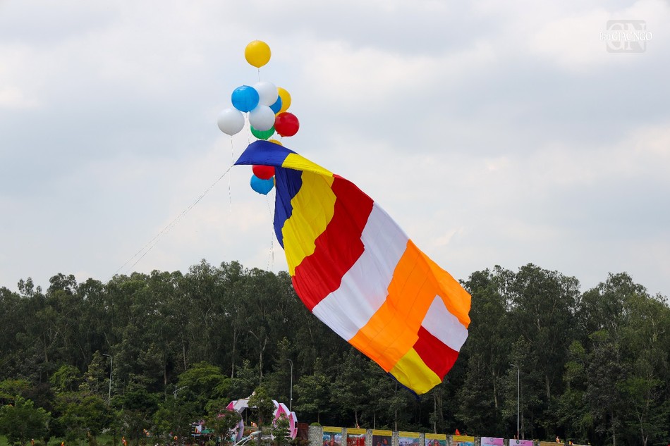 Lá cờ Phật giáo với kích thước 500m2 và quả cầu biểu tượng Phật giáo quốc tế cao 10m, thể hiện cho sự lớn mạnh và lan tỏa của Phật giáo VN |