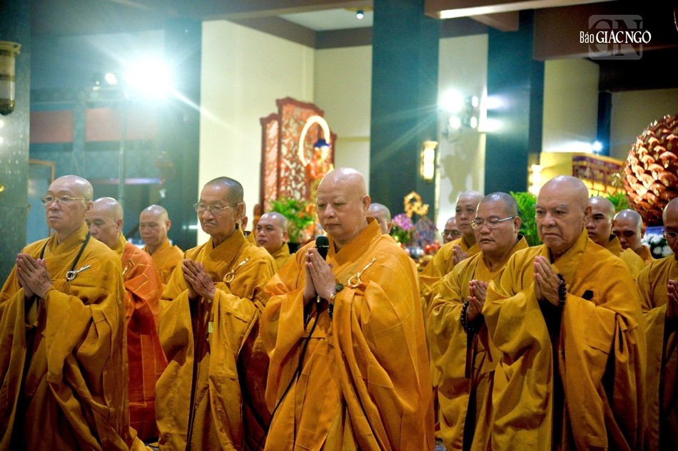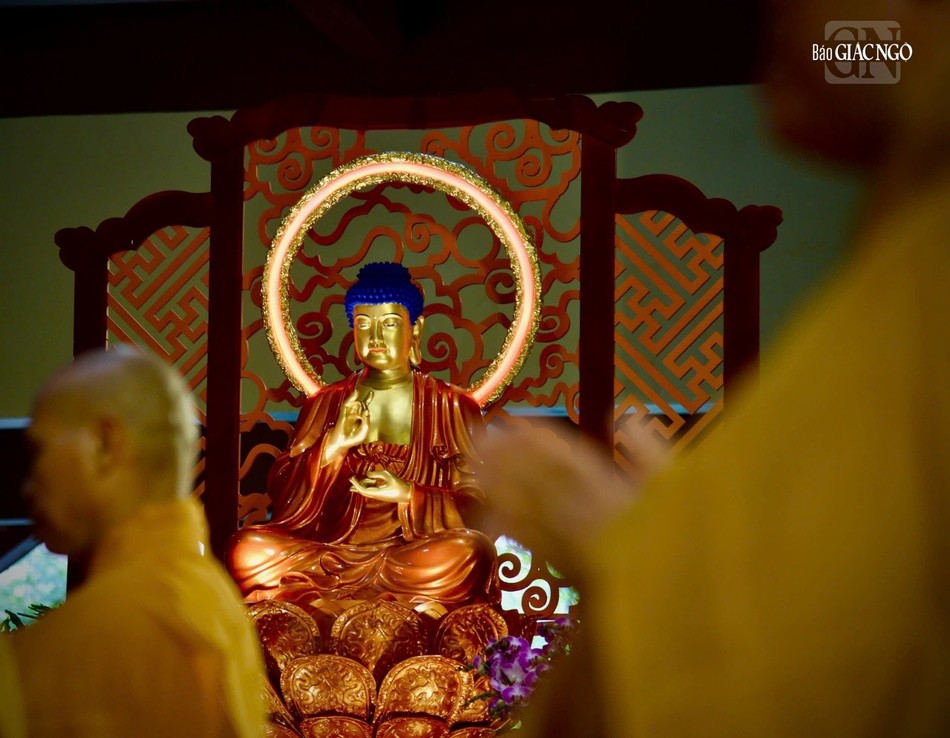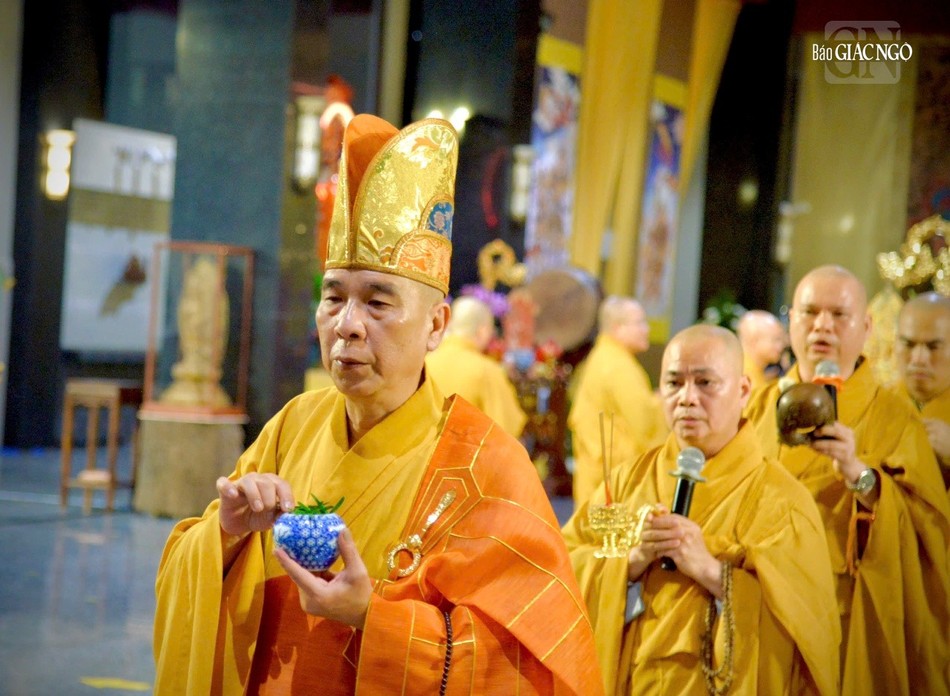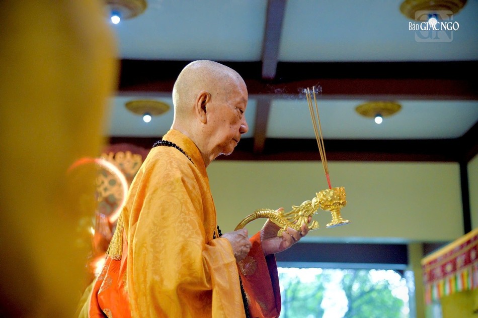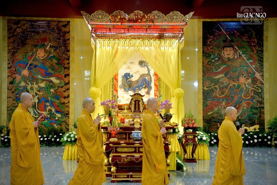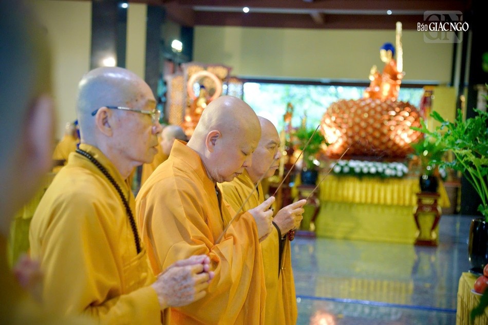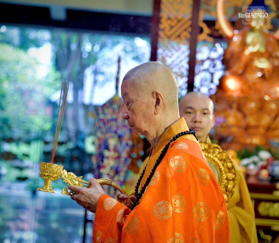 Đại lão Hòa thượng Thích Trí Quảng thân lâm niêm hương cầu nguyện; Hòa thượng Thích Lệ Trang, trụ trì chùa Huê Nghiêm; Thượng tọa Thích Quảng Chơn, Trưởng ban Nghi lễ GHPGVN TP.HCM cùng Ban Nghi lễ, chư vị giáo phẩm, Tăng Ni thực hiện nghi thức sái tịnh đàn tràng, thượng phan, cúng ngọ theo nghi thức thiền môn.