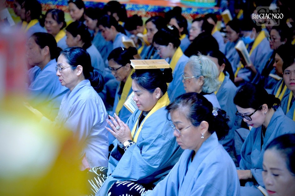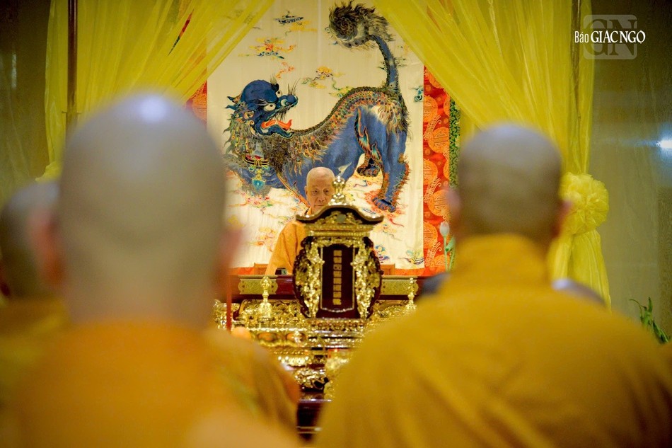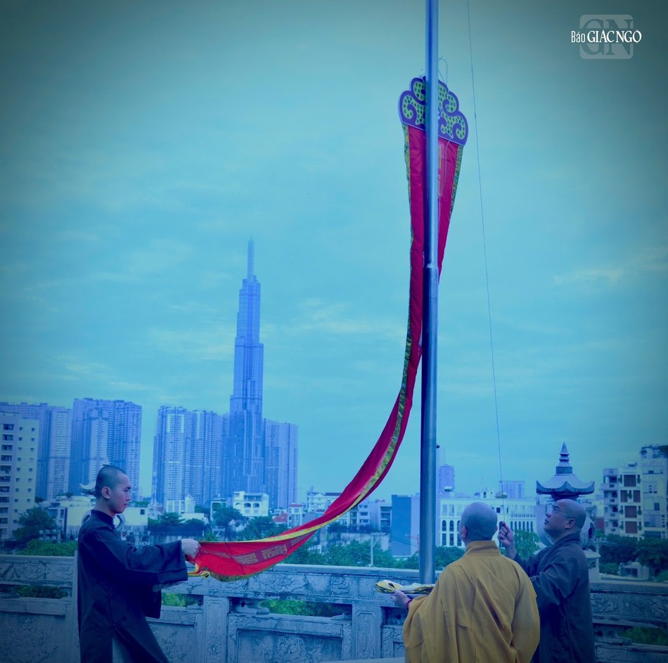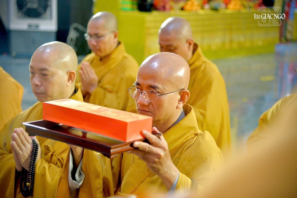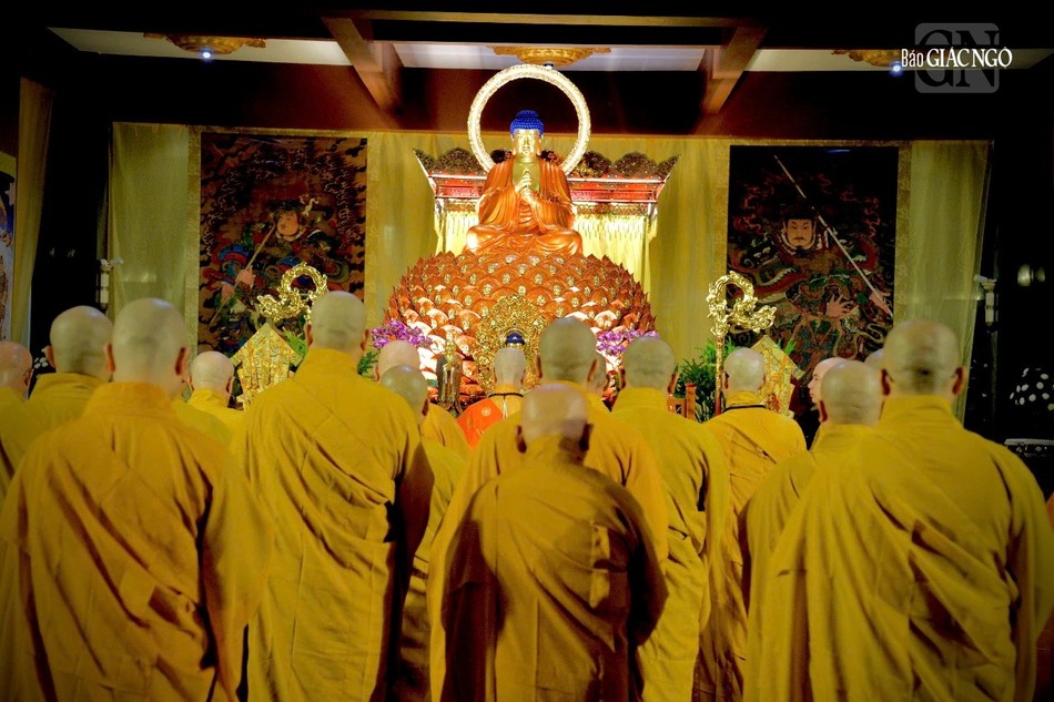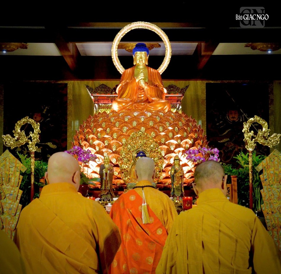 Đại lão Hòa thượng Thích Trí Quảng thân lâm niêm hương cầu nguyện; Hòa thượng Thích Lệ Trang, trụ trì chùa Huê Nghiêm; Thượng tọa Thích Quảng Chơn, Trưởng ban Nghi lễ GHPGVN TP.HCM cùng Ban Nghi lễ, chư vị giáo phẩm, Tăng Ni thực hiện nghi thức sái tịnh đàn tràng, thượng phan, cúng ngọ theo nghi thức thiền môn.