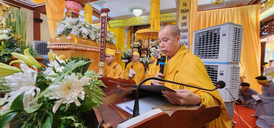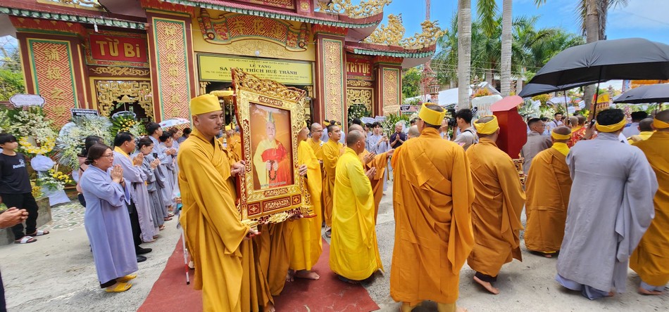 Ban Tổ chức Tang lễ đã cung thỉnh Thượng tọa Thích Phước Cường, Trưởng ban Nghi lễ GHPGVN tỉnh Long An sám chủ, tuyên pháp ngữ và phất trần cung tống kim quan. Môn đồ pháp quyến cung thỉnh lư hương, linh vị, y bát, di ảnh và kim quan Hòa thượng rời Giác linh đường trong tiếng chuông trống Bát-nhã trầm hùng và trong âm vang tiếng niệm Phật của đại chúng đến nơi bảo tháp an vị.
