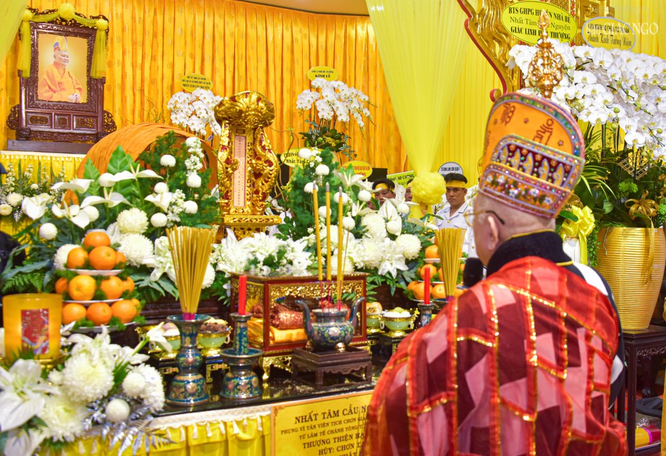 Tiếp đó, Hòa thượng Thích Thiện Tấn cử hành nghi lễ phất trần, cung tuyên pháp ngữ và thực hiện nghi thức di quan; môn đồ pháp quyến cung thỉnh lư hương, di ảnh và y bát của Hòa thượng rời Giác linh đường đến nơi trà-tỳ.