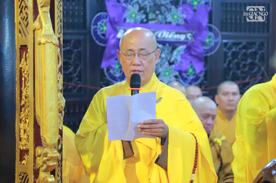 Trước Giác linh đường, Hòa thượng Thích Thiện Hảo, Phó ban Trị sự GHPGVN TP.Thủ Đức đọc lời tưởng niệm của Ban Trị sự GHPGVN TP.Thủ Đức truy tán công hạnh Hòa thượng Thích Trung Phú, người đã có nhiều cống hiến cho sự phát triển của Phật giáo địa phương lúc còn tại thế.