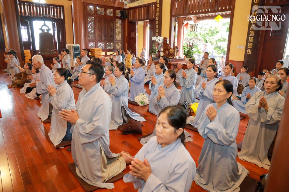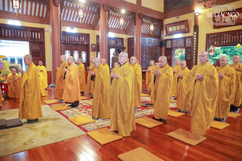 Tại chánh điện, Hòa thượng Thích Huệ Giải sám chủ, cùng Ban Kinh sư cử hành lễ cúng ngọ theo nghi lễ Phật giáo truyền thống kinh đô Phú Xuân.