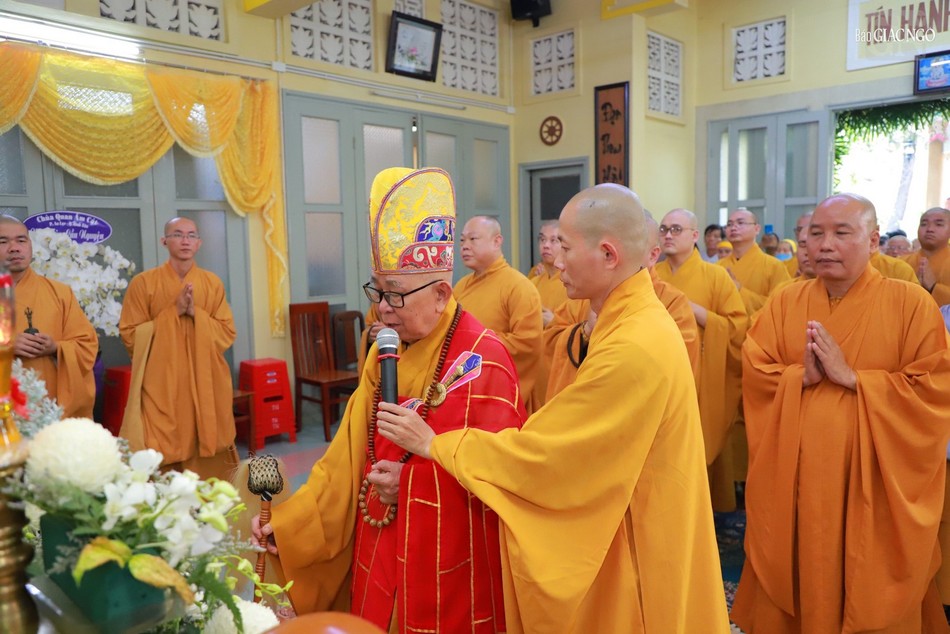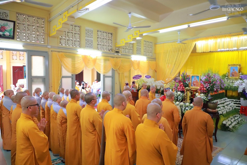 Trước Giác linh đường, chư tôn đức giáo phẩm Tăng Ni đã niêm hương tưởng niệm, Ban nghi lễ cung thỉnh Trưởng lão Hòa thượng Thích Như Tín, Ủy viên Thường trực Hội đồng Chứng minh cung tuyên pháp ngữ, phất trần.