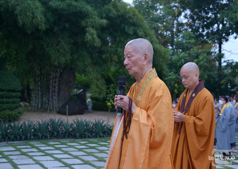 Chư Tăng hướng dẫn Phật tử trì tụng phẩm Phổ môn trong kinh Pháp hoa và đảnh lễ 12 lời nguyện của Bồ-tát, hồi hướng cầu nguyện an lành đến với tất cả.