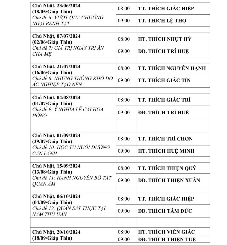 Theo đó, ngày 18-3-2024, Hòa thượng Thích Nhựt Hỷ, Phó ban Trị sự kiêm Trưởng ban Hoằng pháp GHPGVN TP.HCM đã ký thông tin phổ biến về Lịch thuyết giảng Phật pháp năm 2024 tại giảng đường chùa Phổ Quang (số 21 đường Huỳnh Lan Khanh, P.2, Q.Tân Bình, TP.HCM) với các chủ đề và các vị giảng sư như sau: