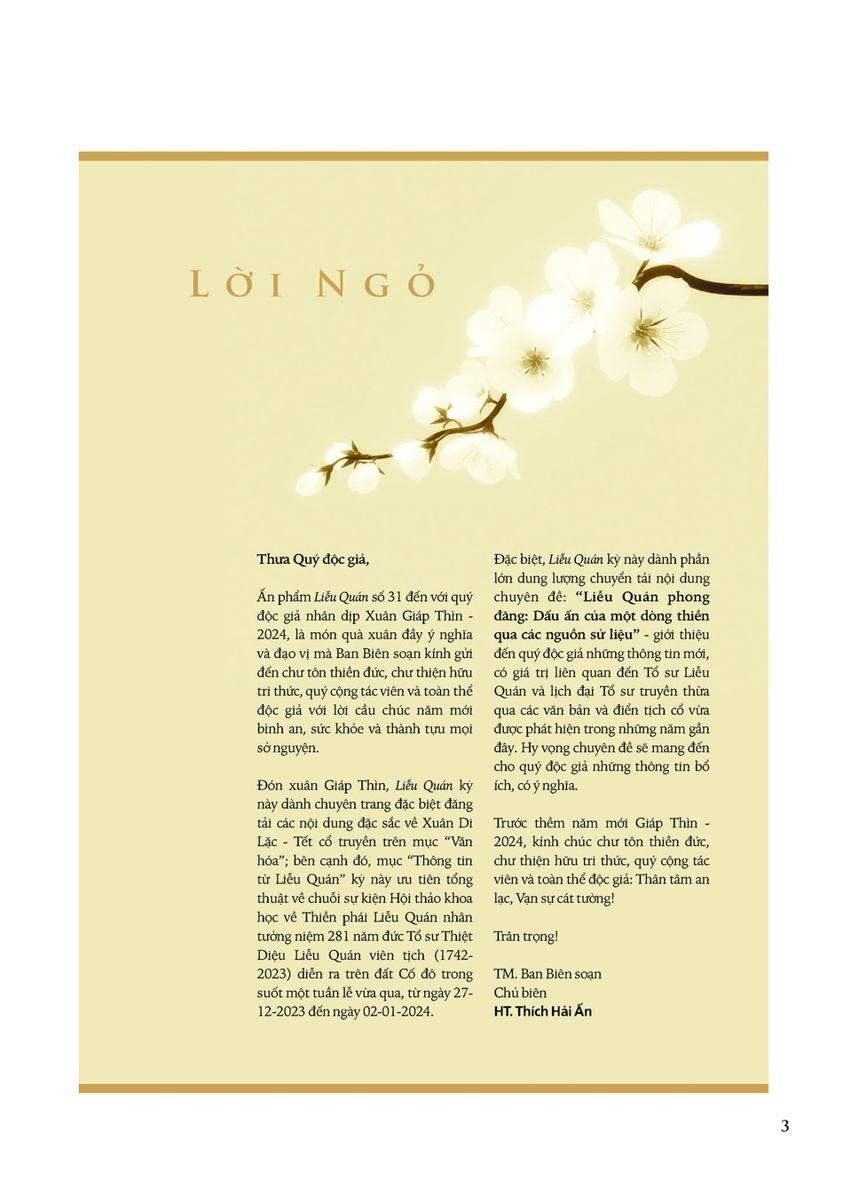 Ấn phẩm Liễu Quán số 31 dành chuyên trang đặc biệt đăng tải các nội dung đặc sắc về Xuân Di Lặc - Tết cổ truyền trên mục “Văn hóa”; bên cạnh đó, mục “Thông tin từ Liễu Quán” kỳ này ưu tiên tổng thuật về chuỗi sự kiện Hội thảo khoa học về Thiền phái Liễu Quán nhân tưởng niệm 281 năm Đức Tổ sư Thiệt Diệu Liễu Quán viên tịch (1742-2023) diễn ra trên đất Cố đô trong suốt một tuần lễ vừa qua, từ ngày 27-12-2023 đến ngày 2-1-2024.