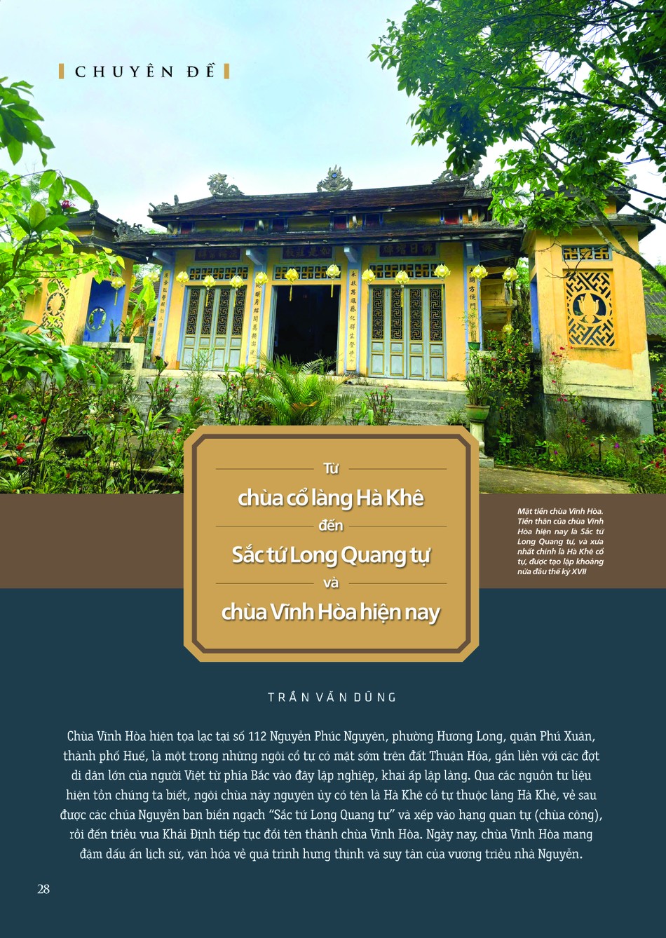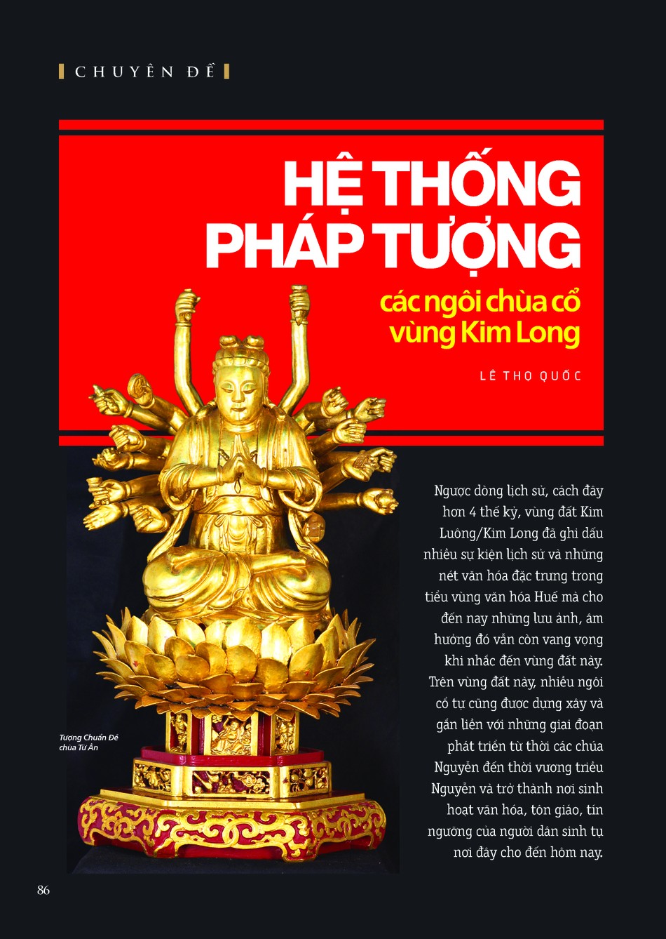 Với chuyên đề “Chùa cổ miền phủ đệ Kim Long”, ấn phẩm Liễu Quán số 35 giới thiệu đến độc giả hệ thống những ngôi quan tự (chùa công), chùa làng, chùa họ tộc và chùa tư nhân,…có tuổi đời đáng kính cùng hệ thống tư liệu, văn tịch hiện tồn có niên đại trải dài từ thời Cảnh Hưng cho đến cận hiện đại.
