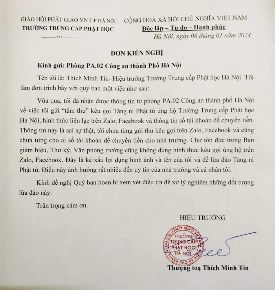 Trong đơn kiến nghị, Thượng tọa Thích Minh Tín trình bày rõ: Đối tượng đã dùng hình thức liên lạc trên các tài khoản mạng xã hội Zalo, Facebook để đăng "tâm thư" và thông tin số tài khoản kêu gọi Tăng Ni, Phật tử chuyển tiền ủng hộ nhà trường.