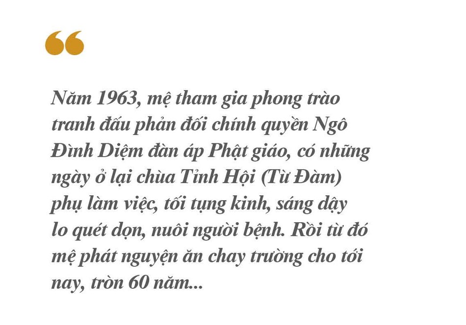 Năm 1963, mệ tham gia phong trào tranh đấu phản đối chính quyền Ngô Đình Diệm đàn áp Phật giáo, có những ngày ở lại chùa Tỉnh Hội (Từ Đàm) phụ làm việc, tối tụng kinh, sáng dậy lo quét dọn, nuôi người bệnh. Mệ nhớ lại: “Hồi đó không thấy vất vả, không mệt. Cái tâm mình cứ rứa mà làm, không buồn, cũng không vui không có chi hết. Cái đó là từ nhỏ nó vậy”. Rồi từ đó mệ phát nguyện ăn chay trường cho tới nay, đã 60 năm để cầu cho Phật giáo trường tồn và cho những đạo hữu của mình được khỏe mạnh.
