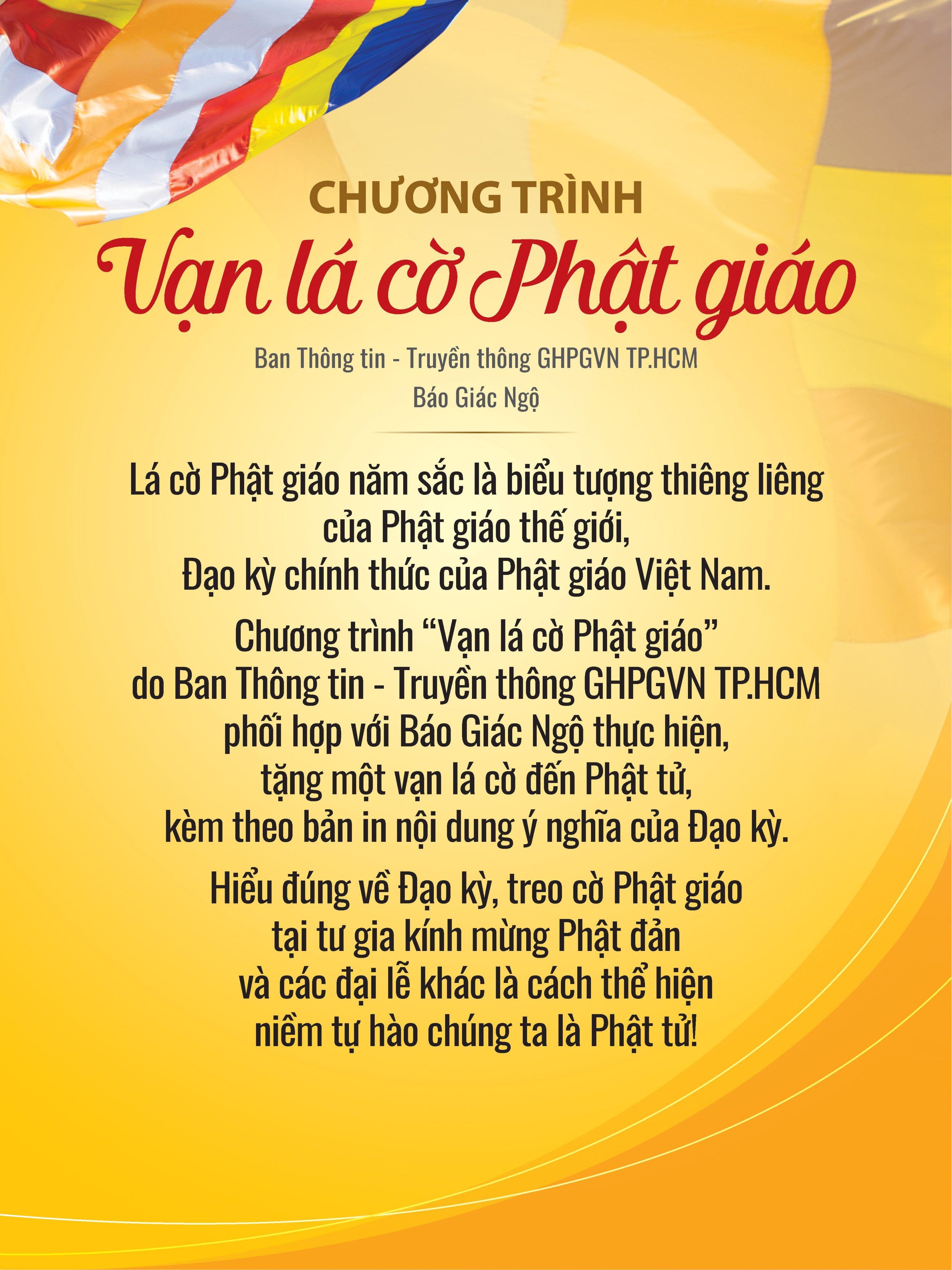 GNO - Kính mừng Đại lễ Phật đản Phật lịch 2565, hướng đến kỷ niệm 40 năm thành lập GHPGVN, Ban Thông tin - Truyền thông Phật giáo TP.HCM kết hợp với Báo Giác Ngộ thực hiện chương trình “Vạn lá cờ Phật giáo” gửi tặng đến Phật tử để treo tại tư gia.