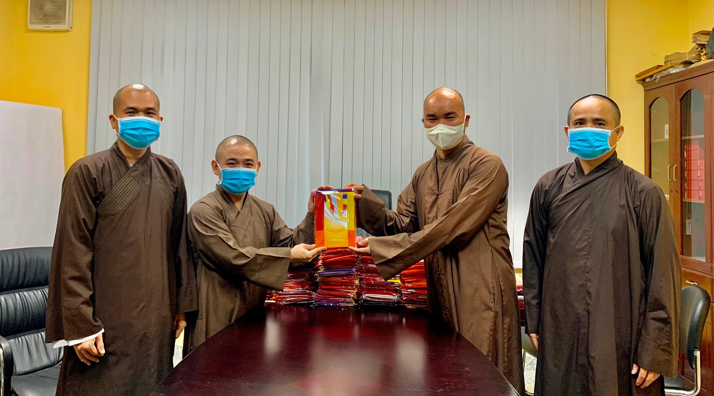 “Vạn lá cờ Phật giáo” được sự tham gia tùy hỷ của chư tôn đức, các thành viên Ban Thông tin - Truyền thông và Phật tử, số lượng thực hiện trong dịp này 10.000 lá, chất liệu vải kete, khổ 90x60cm, đính kèm bản in ý nghĩa lá cờ Phật giáo.