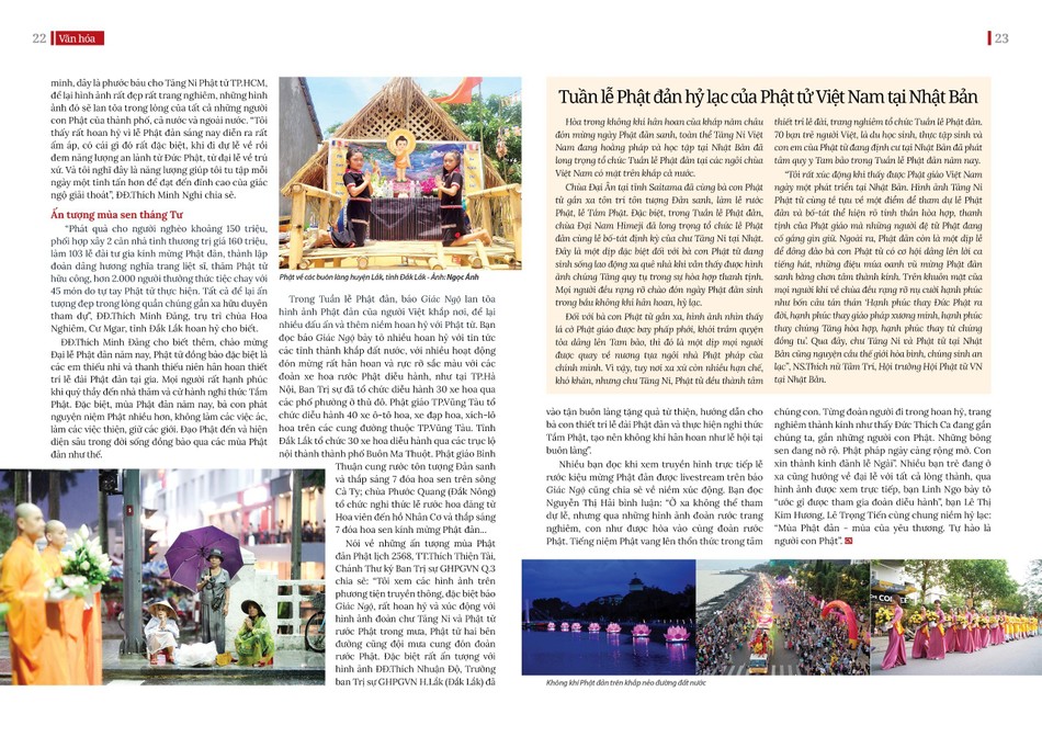 Trong Tuần lễ Phật đản, báo Giác Ngộ lan tỏa hình ảnh Phật đản của người Việt khắp nơi, để lại nhiều dấu ấn và thêm niềm hoan hỷ với Phật tử. Bạn đọc báo Giác Ngộ bày tỏ nhiều hoan hỷ với tin tức các tỉnh thành khắp đất nước, với nhiều hoạt động đón mừng rất hân hoan và rực rỡ sắc màu với các đoàn xe hoa rước Phật diễu hành, như tại TP.Hà Nội, Ban Trị sự đã tổ chức diễu hành 30 xe hoa qua các phố phường ở thủ đô. Phật giáo TP.Vũng Tàu tổ chức diễu hành 40 xe ô-tô hoa, xe đạp hoa, xích-lô hoa trên các cung đường thuộc TP.Vũng Tàu. Tỉnh Đắk Lắk tổ chức 30 xe hoa diễu hành qua các trục lộ nội thành thành phố Buôn Ma Thuột. Phật giáo Bình Thuận cung rước tôn tượng Đản sanh và thắp sáng 7 đóa hoa sen trên sông Cà Ty; chùa Phước Quang (Đắk Nông) tổ chức nghi thức lễ rước hoa đăng từ Hoa viên đến hồ Nhân Cơ và thắp sáng 7 đóa hoa sen kính mừng Phật đản...