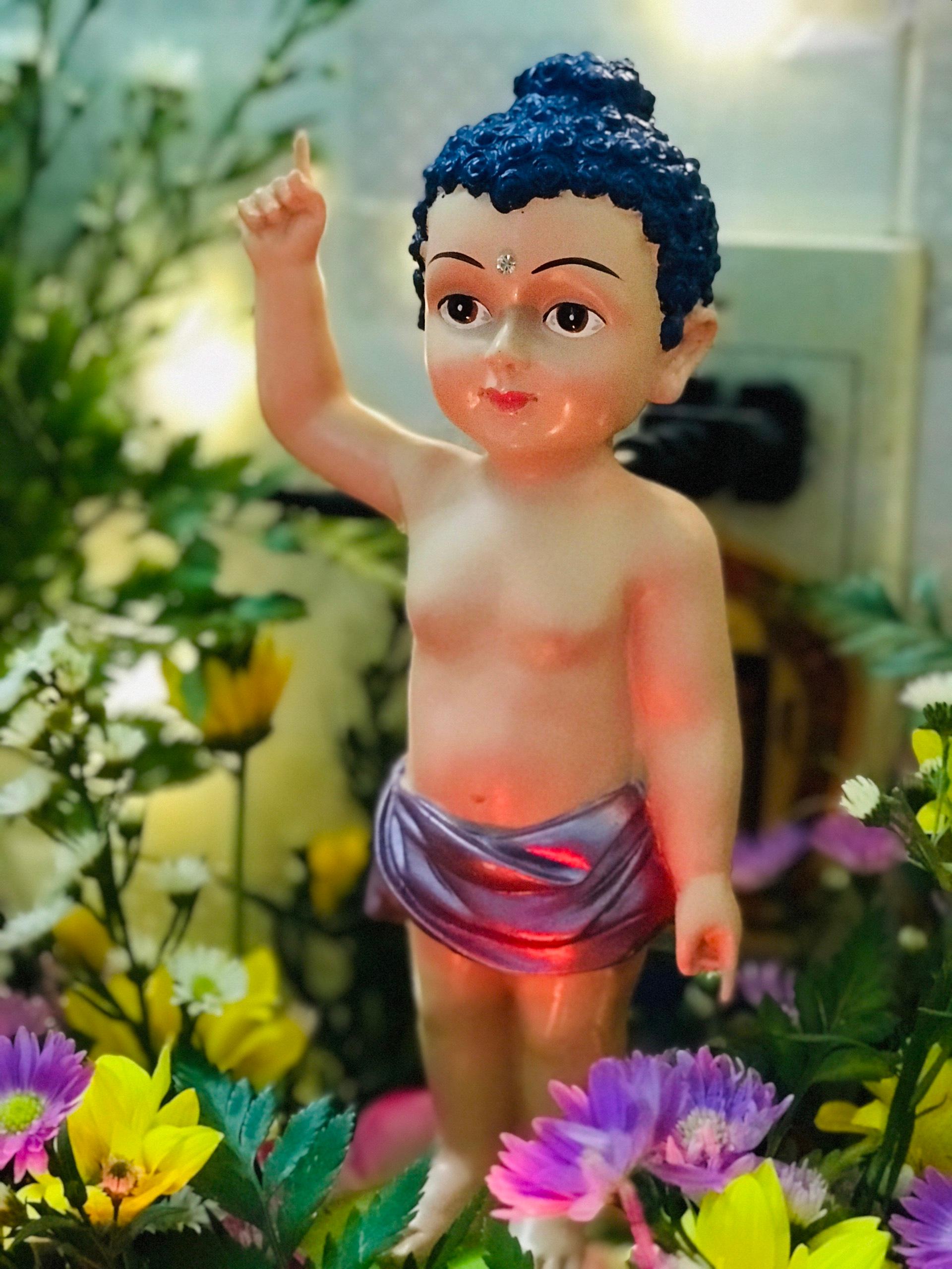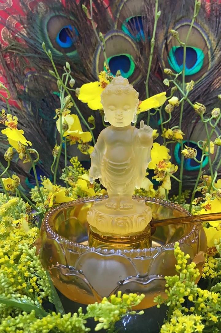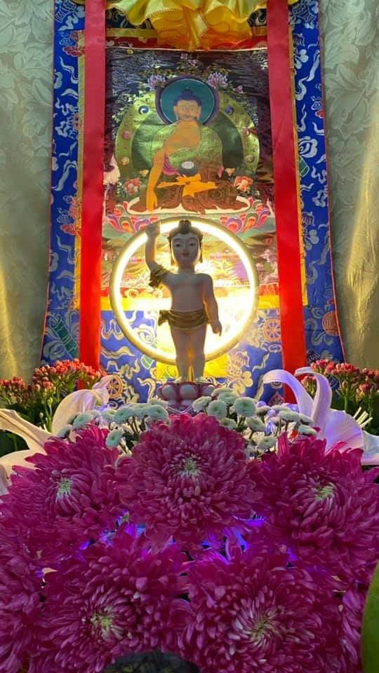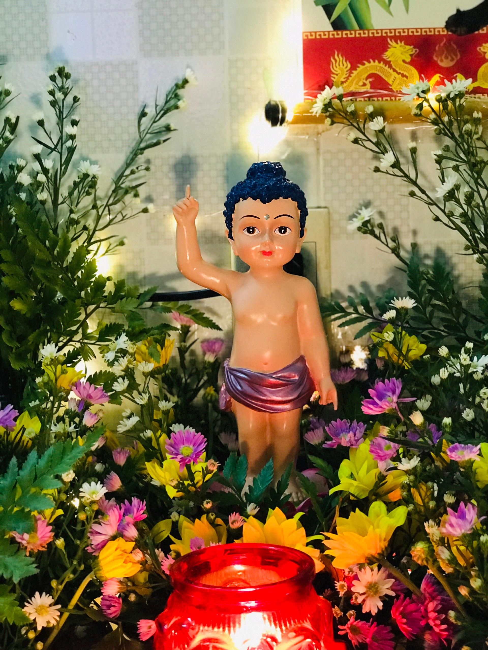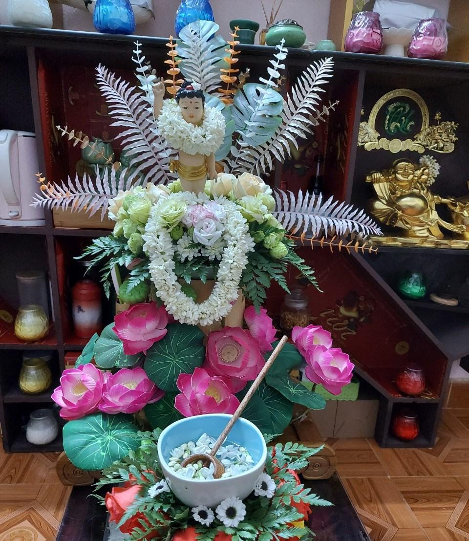 | Đức Phật sơ sinh được thiết trí tại tại tư gia Phật tử cúng dường Phật đản Phật lịch 2565 - Ảnh: QÂTV |