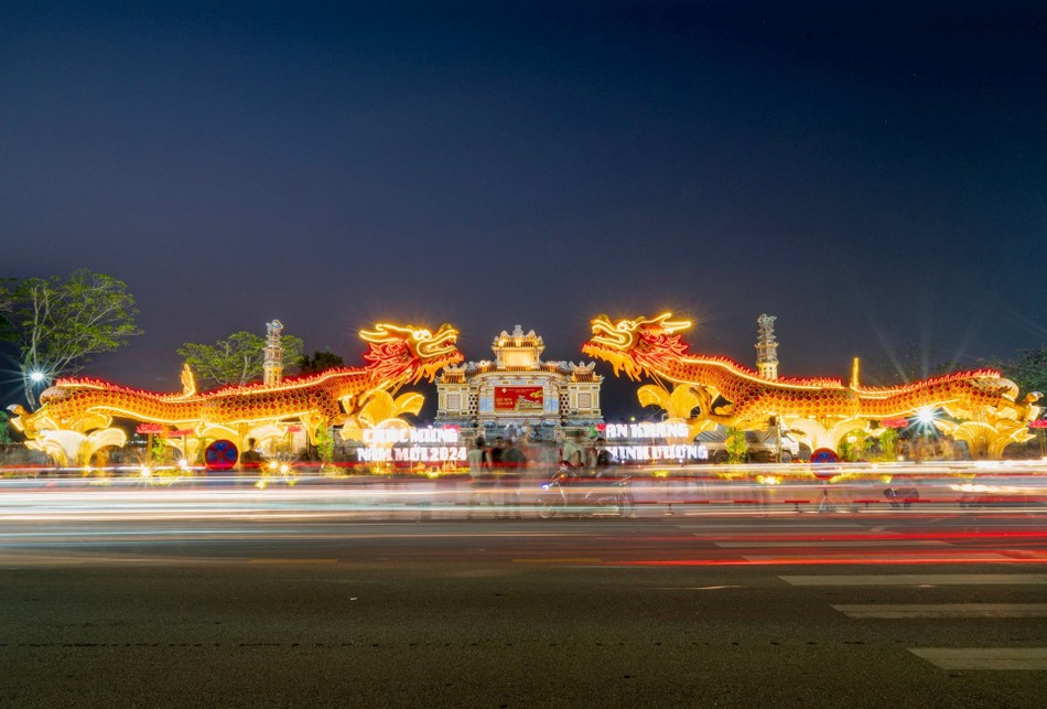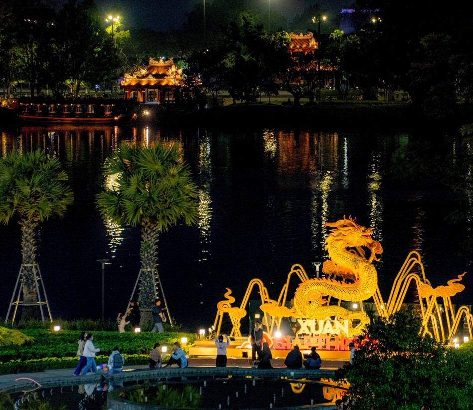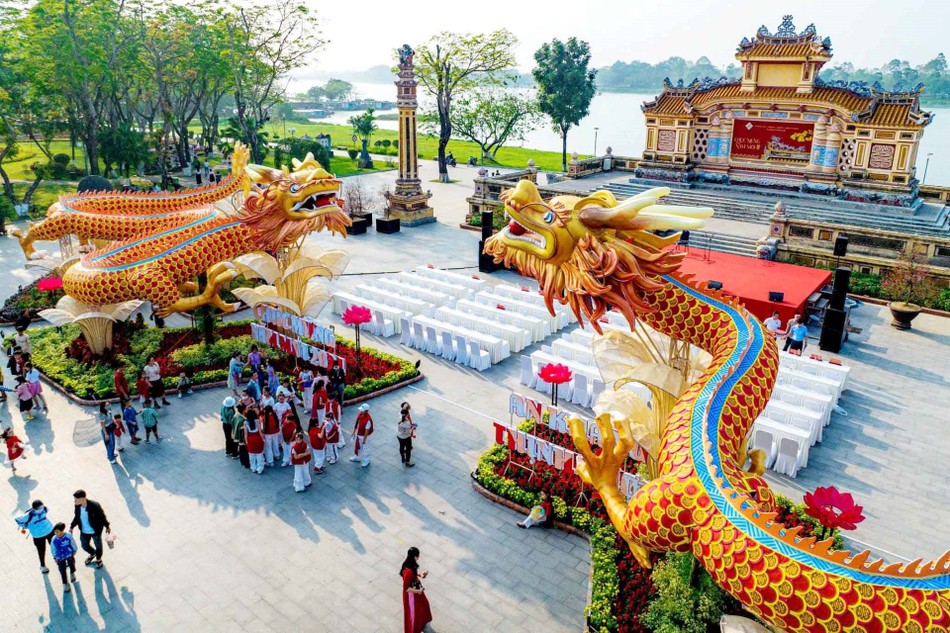 Được biết, linh vật rồng Tết Giáp Thìn 2024 tại TP.Huế lấy ý tưởng từ rồng thời nhà Nguyễn, có chiều cao 7m và chiều dài 35m, được đặt tại không gian phía trước cổng Trường Quốc học Huế, bia Quốc học cạnh bờ sông Hương và đường Lê Lợi. Cặp linh vật rồng này có nét uyển chuyển nhưng vẫn giữ sự uy nghi vốn có.