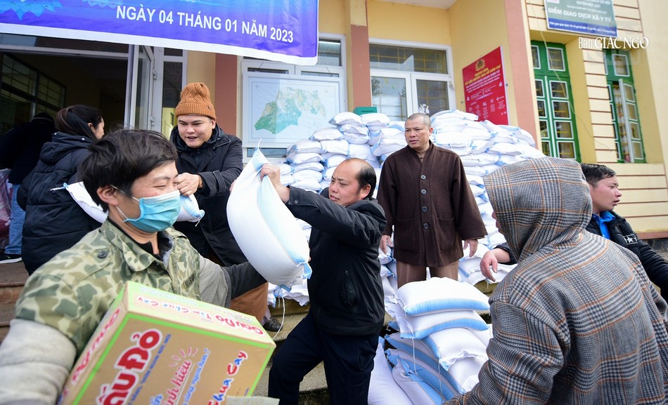 Theo đó, Thượng tọa Thích Thanh Phong, Phó Chủ tịch Hội đồng Trị sự, Phó Trưởng ban Trị sự kiêm Trưởng ban Từ thiện - Xã hội Phật giáo TP.HCM đã hướng dẫn Tăng Ni, Phật tử trong đoàn trao tặng các phần quà đầu tiên đến người dân tại Lào Cai và Lai Châu.