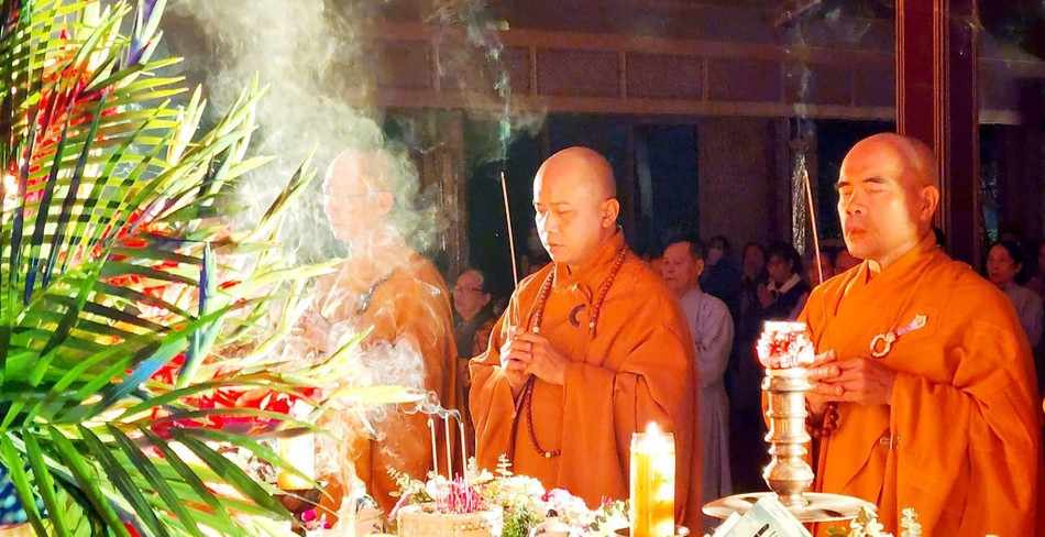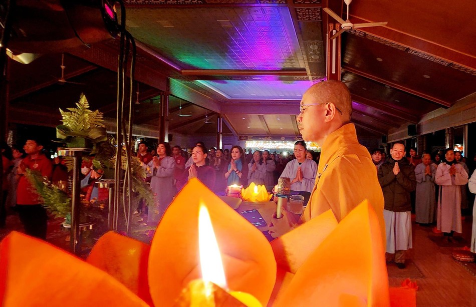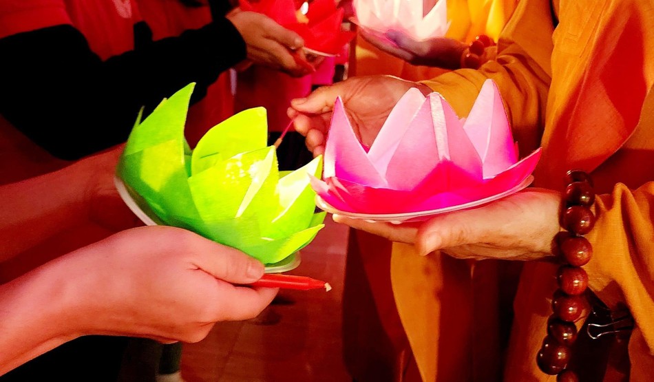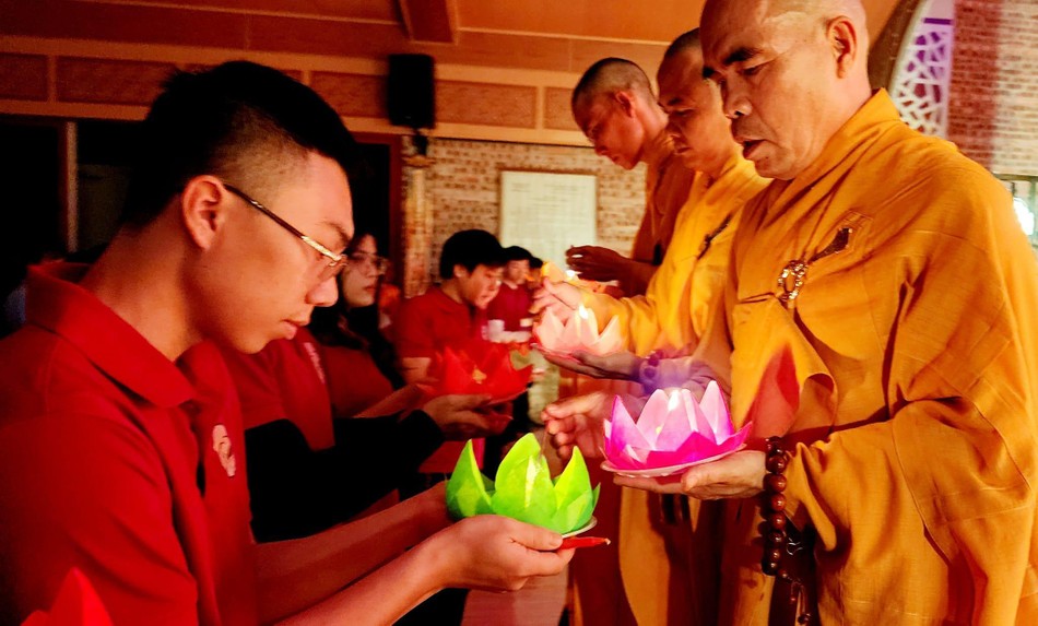 Chư tôn đức Tăng, Phật tử đạo tràng Hương Sen cùng các em gia đình Vườn Tuệ thành kính, trang nghiêm niêm hương, bạch Phật. Trong không khí thiêng liêng và trầm mặc, chư tôn đức Tăng đã tiếp nhận ngọn lửa thiêng từ Phật đài, truyền trao tới hàng Phật tử,