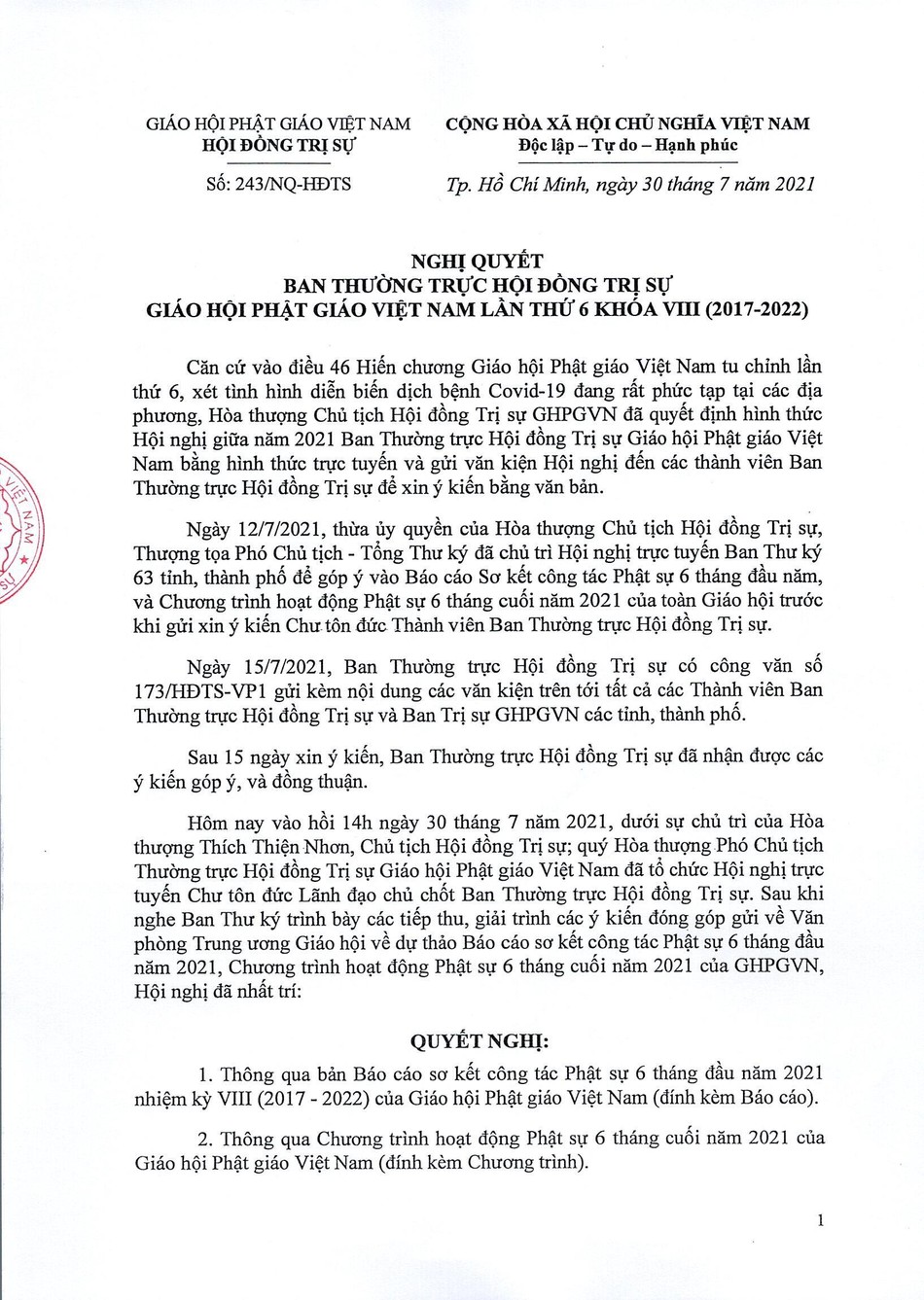 1. Thông qua bản báo cáo sơ kết công tác Phật sự 6 tháng đầu năm 2021 nhiệm kỳ VIII (2017 - 2022) của GHPGVN..