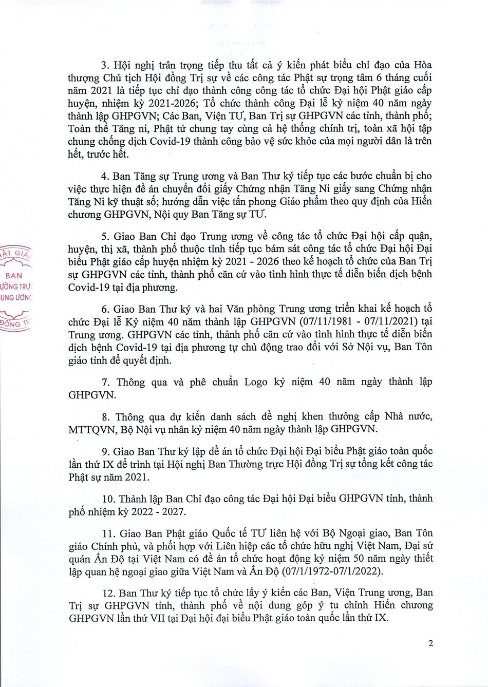 3. Hội nghị trân trọng tiếp thu tất cả ý kiến phát biểu chỉ đạo của Hòa thượng Chủ tịch Hội đồng Trị sự về các công tác Phật sự trọng tâm 6 tháng cuối năm 2021 là tiếp tục chỉ đạo thành công công tác tổ chức Đại hội Phật giáo cấp huyện, nhiệm kỳ 2021-2026; Tổ chức thành công Đại lễ kỷ niệm 40 năm ngày thành lập GHPGVN; Các Ban, Viện T.Ư, Ban Trị sự GHPGVN các tỉnh, thành phố; Toàn thể Tăng Ni, Phật tử chung tay cùng cả hệ thống chính trị, toàn xã hội tập chung chống dịch Covid-19 thành công bảo vệ sức khỏe của mọi người dân là trên hết, trước hết.