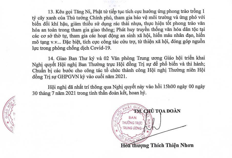 14. Giao Ban Thư ký và 2 Văn phòng Trung ương Giáo hội triển khai Nghị quyết Hội nghị Ban Thường trực Hội đồng Trị sự để phổ biến và thi hành; Chuẩn bị các bước cho công tác tổ chức thành công Hội nghị Thường niên Hội đồng Trị sự GHPGVN kỳ vào cuối năm 2021.