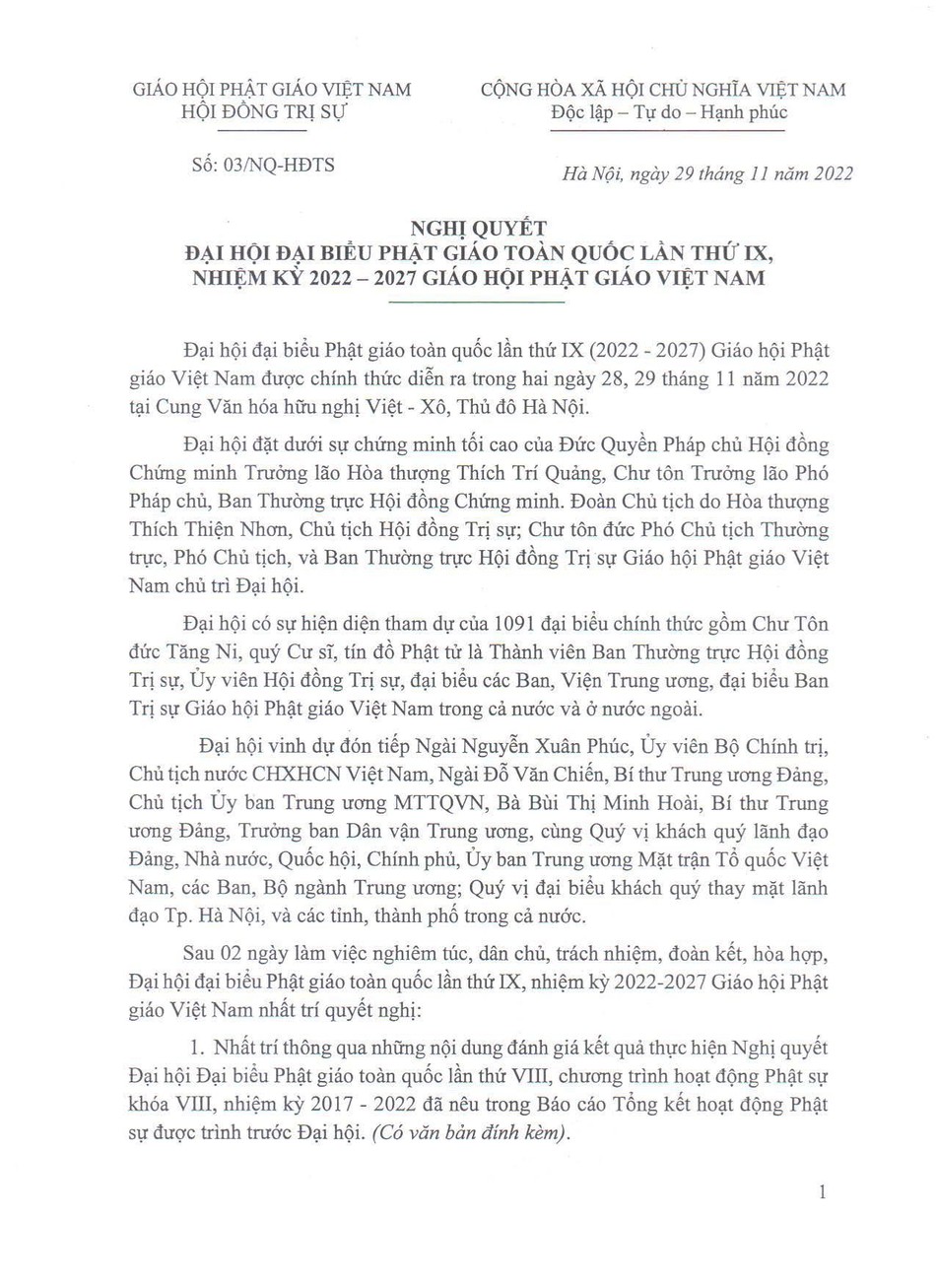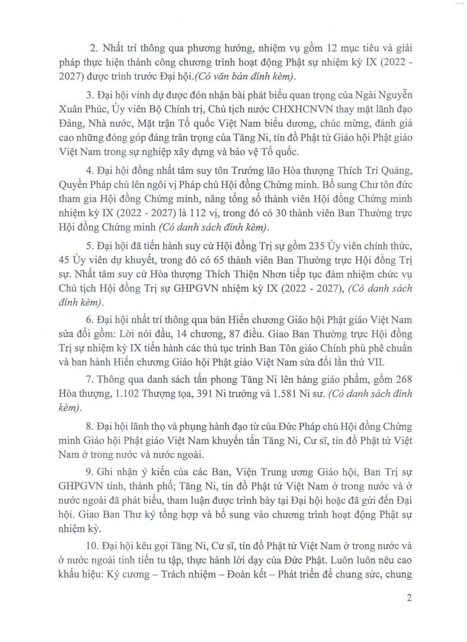 Sau 2 ngày làm việc nghiêm túc, dân chủ, trách nhiệm, đoàn kết, hòa hợp, Đại hội đại biểu Phật giáo toàn quốc lần thứ IX (2022-2027) GHPGVN nhất trí quyết nghị: