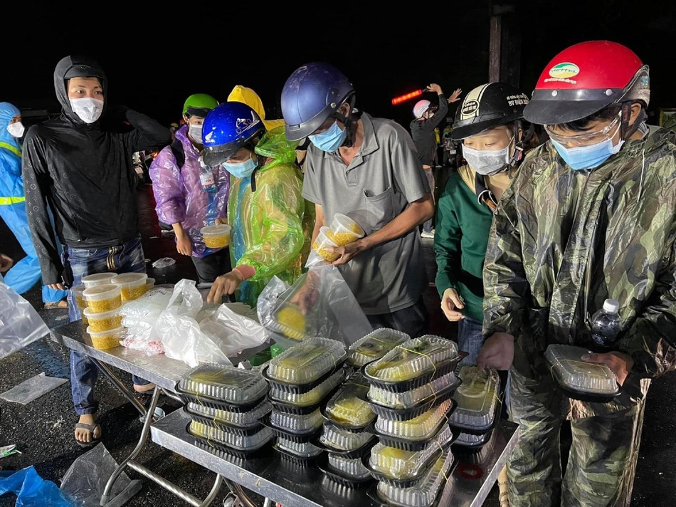 Những đêm tại Trạm trung chuyển phía Nam hầm Hải Vân, trời mưa nặng hạt do ảnh hưởng áp thấp nhiệt đới và bão số 8, nhưng hàng chục người vẫn cùng các thành viên những nhóm thiện nghuyện như SOS Đà Nẵng, CLB Vạn Tình, CLB xe bán tải Đà Nẵng, nhóm Cửu liên Tịnh độ Đà Nẵng và Câu lạc bộ Trường chay Đà Nẵng, nhóm từ thiện Sư phụ thai nhi... bận rộn chuẩn bị các suất ăn cho đoàn người dân đi về từ các tỉnh phía Nam về quê.