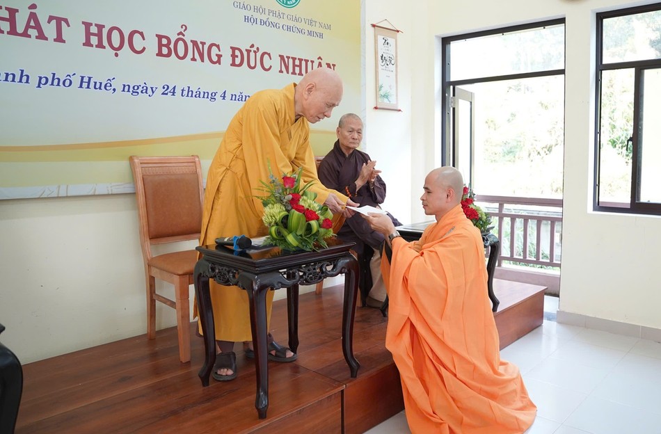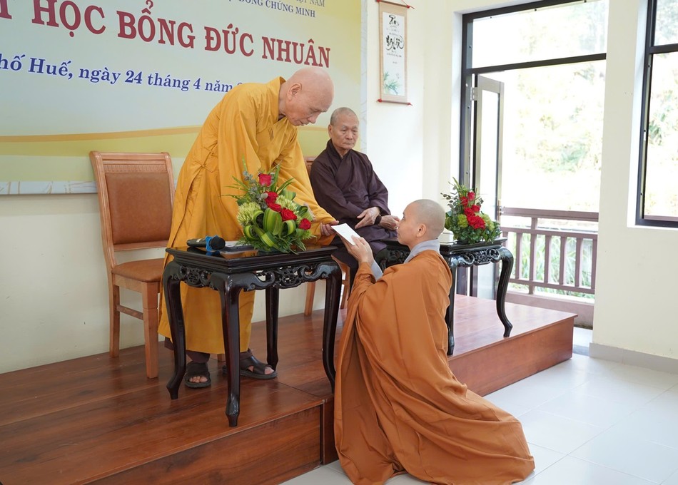 Tham dự phát học bổng có Hòa thượng Thích Hải Ấn, Ủy viên Thường trực Hội đồng Trị sự, Viện trưởng Học viện Phật giáo VN tại Huế; Thượng tọa Thích Giác Dũng, Ủy viên Hội đồng Trị sự, Thư ký Văn phòng Hội đồng Chứng minh; cùng chư tôn đức Hội đồng Điều hành Học viện, quý vị giảng viên và các Tăng Ni sinh được nhận học bổng đợt này.
