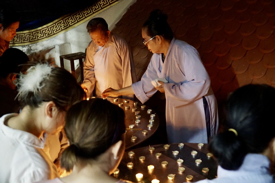 Ở chùa, dưới bếp các cô bác chia nhau người công quả nấu thức ăn, người làm nến, thiết đàn tràng. Trên chánh điện và lễ đài ngoài sân chùa, thầy trụ trì và Phật tử bưng bê, thiết trí, cắm hoa, dựng rạp, trang hoàng làm đẹp không gian buổi lễ. Ai cũng chuyên tâm trong phần việc mình đăng ký làm cho không khí Phật đản tại ngôi chùa nhỏ vùng ngoại ô thành phố thêm ấm áp.