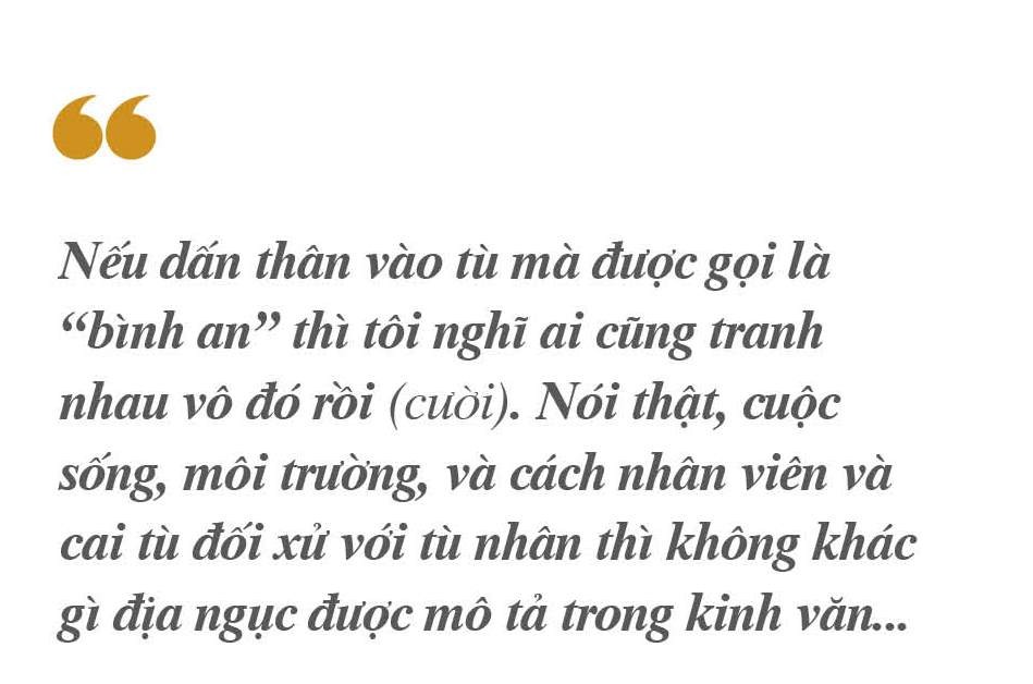 - Nếu dấn thân vào tù mà được gọi là “bình an” thì tôi nghĩ ai cũng tranh nhau vô đó rồi (cười). Thật sự việc vào tù giảng dạy là một tình cờ. Lúc đầu tôi nghĩ đi cho biết và không có dự tính gì hết. Nhưng sau vài lần thăm tù, nghe những mẩu chuyện của tù nhân bị bạo hành, ngược đãi, hiếp dâm khi còn nhỏ, tận mắt thấy được cái khổ trong tù, vậy mà những pháp hữu vẫn chấp nhận cuộc sống trong tù, họ tìm thấy được niềm hỷ lạc và chút khinh an qua thiền tập, hiểu thấu lời Phật dạy. Đó là động cơ làm cho tôi tiếp tục vào thăm họ gần 10 năm nay. Nói thật, cuộc sống, môi trường, và cách nhân viên và cai tù đối xử với tù nhân thì không khác gì địa ngục được mô tả trong kinh văn.