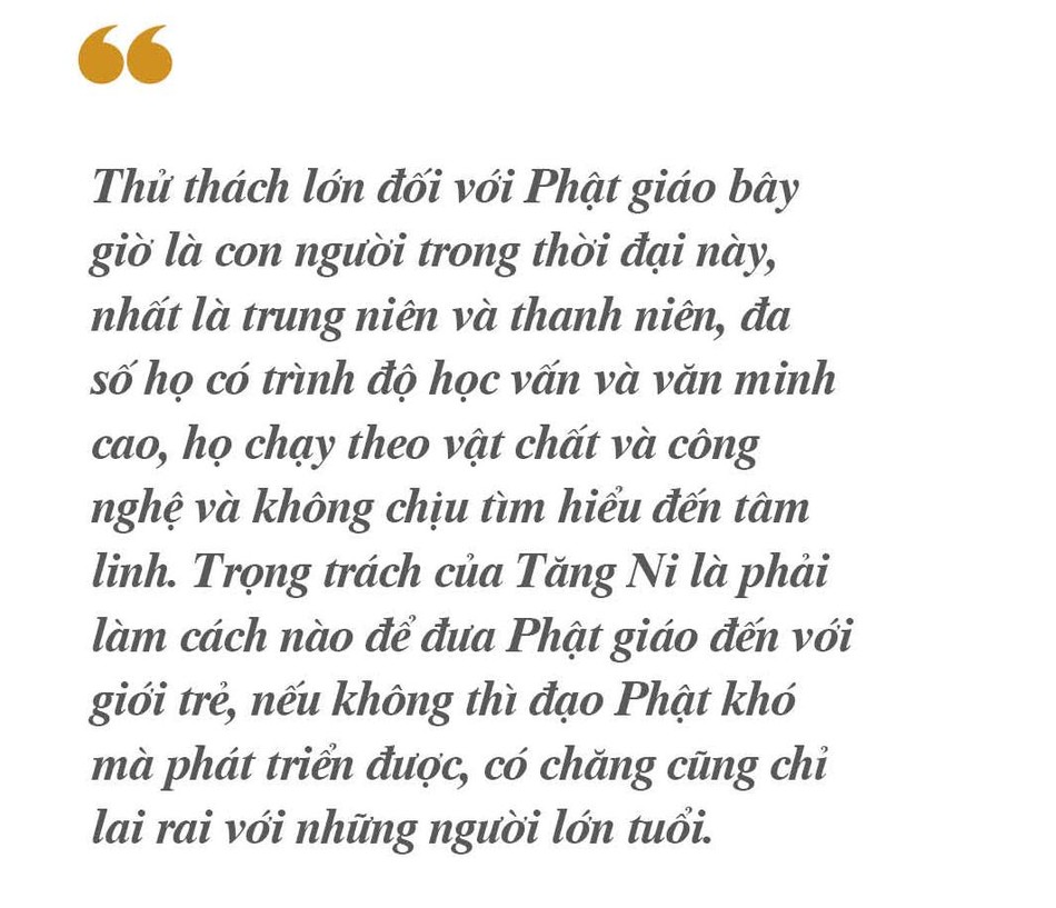 Thử thách lớn đối với Phật giáo bây giờ là con người trong thời đại này, nhất là trung niên và thanh niên, đa số họ có trình độ học vấn và văn minh cao, họ chạy theo vật chất và công nghệ và không chịu tìm hiểu đến tâm linh. Chùa chiền bây giờ thường chỉ có những người lớn tuổi. Trọng trách của Tăng Ni là phải làm cách nào để đưa Phật giáo đến với giới trẻ, nếu không thì đạo Phật khó mà phát triển được, có chăng cũng chỉ lai rai với những người lớn tuổi.