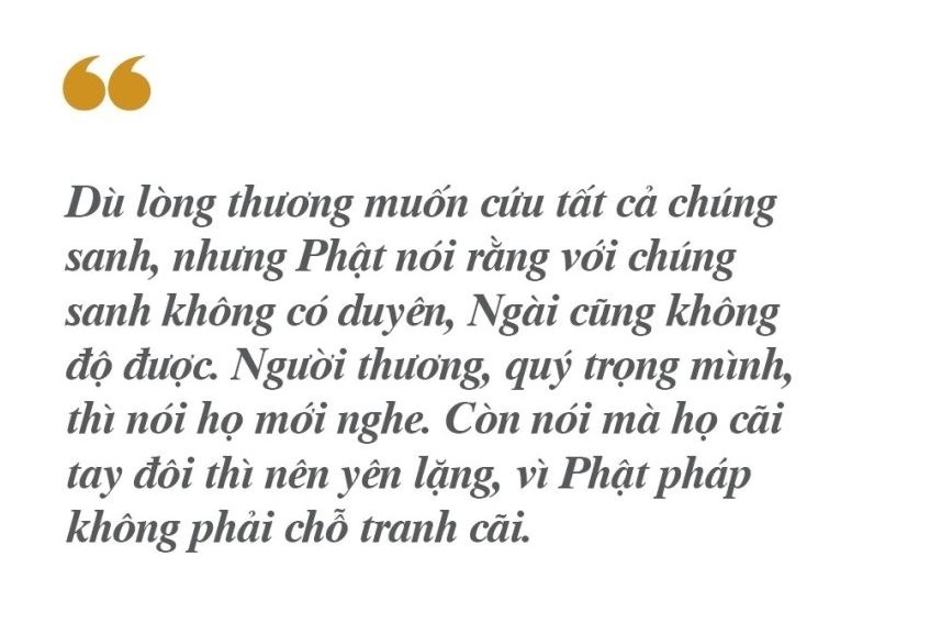 Dù lòng thương muốn cứu tất cả chúng sanh, nhưng Phật nói rằng với chúng sanh không có duyên, Ngài cũng không độ được. Người thương, quý trọng mình, thì nói họ mới nghe. Còn nói mà họ cãi tay đôi thì nên yên lặng, vì Phật pháp không phải chỗ tranh cãi. Mình phải có sở đắc và người nghe cũng phải có cùng tần số mới nói được. Pháp giới chúng sanh rộng vô cùng, nhưng mình tìm người có duyên đến giáo hóa.