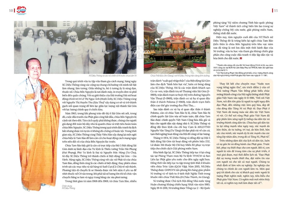 Thay lời kết cho chuyên mục “Nước non vọng tiếng ngàn thu”, xin trích diễm ý của cố Thủ tướng Phạm Văn Đồng phát biểu chúc mừng thành công của Hội nghị thống nhất Phật giáo Việt Nam vào ngày 8-11-1981, “Đối với Việt Nam, nói đến tôn giáo là người ta nghĩ ngay đến đạo Phật, đến những việc làm quý báu, đẹp đẽ của đông đảo Tăng Ni và Phật tử. Đạo Phật ở Việt Nam đã mang màu sắc dân tộc Việt Nam rõ rệt. Có thể nói rằng Phật giáo Việt Nam đã góp phần làm sáng ngời lý tưởng của dân tộc và trưởng thành cùng dân tộc. Chưa bao giờ dân tộc ta lại vững mạnh như ngày nay, sức mạnh do bản thân, do tư tưởng, trí tuệ, do bản lĩnh, bản sắc của mình; sức mạnh ấy là sức mạnh của các tầng lớp nhân dân, trong đó có Tăng Ni, Phật tử”.
