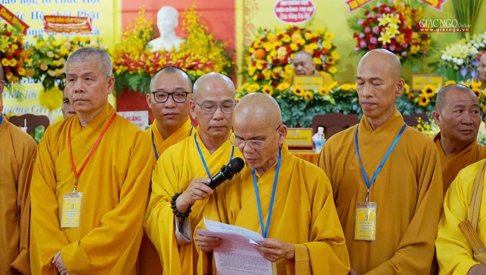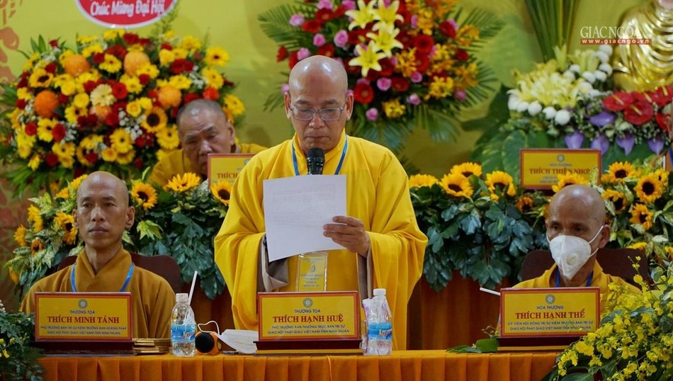 "Đại hội đại biểu Phật giáo tỉnh Ninh Thuận lần thứ VII (2022-2027), hôm nay diễn ra trong không khí trang nghiêm trọng thể và thắm thiết tình người, tình đạo, khẳng định tinh thần đoàn kết, hòa hợp được phát huy vững mạnh theo phương châm: “Đạo pháp - Dân tộc - Chủ nghĩa xã hội”. Lịch sử Phật giáo tỉnh nhà sẽ đánh dấu một bước ngoặc phát triển mới, thông qua chương trình hoạt động công tác Phật sự nhiệm kỳ sắp đến, với tập thể và cá nhân có đủ năng lực và ổn định mang tính kế thừa, sẽ hoàn thành Phật sự mà Đại hội giao phó", Hòa thượng Trưởng ban Tổ chức khẳng định.