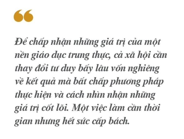 Để chấp nhận những giá trị của một nền giáo dục trung thực, cả xã hội cần thay đổi tư duy bấy lâu vốn nghiêng về kết quả mà bất chấp phương pháp thực hiện và cách nhìn nhận những giá trị cốt lõi. Một việc làm cần thời gian nhưng hết sức cấp bách. Chính vì “ai cũng gù” nên sinh ra những tệ hại trong quan hệ kinh tế và xã hội, nguồn cơn của “lợi ích nhóm”, của những dự án thất bại não nề ném đi hàng nghìn tỷ. Vì không nói thật nên ai cũng yên lặng bỏ qua những lỗi lầm cả sự gian dối, đảo lộn trắng đen, xáo trộn cương thường, trật tự xã hội.