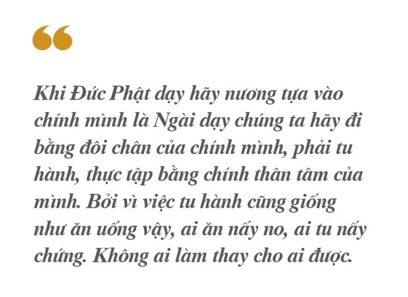Trước đây khi đọc lời dạy của Đức Phật trong kinh Trường bộ (kinh Đại bát Niết-bàn, số 16): “Hãy tự mình là ngọn đèn cho chính mình, hãy tự mình nương tựa chính mình, không nương tựa một cái gì khác. Dùng Chánh pháp làm ngọn đèn, dùng Chánh pháp làm chỗ nương tựa, không nương tựa một cái gì khác”, tôi không hiểu mấy. Vì một mặt Ngài bảo hãy nương tựa vào chính mình, mặt khác lại bảo hãy nương tựa vào Chánh pháp. Vậy chúng ta cần nương tựa vào đâu, vào chính mình hay Chánh pháp? Và nếu nương tựa vào cả hai thì có chướng ngại nhau không? Bây giờ thì tôi đã thông suốt được điều này, thấy rằng sự kết hợp ấy là cần thiết và không chướng ngại nhau.