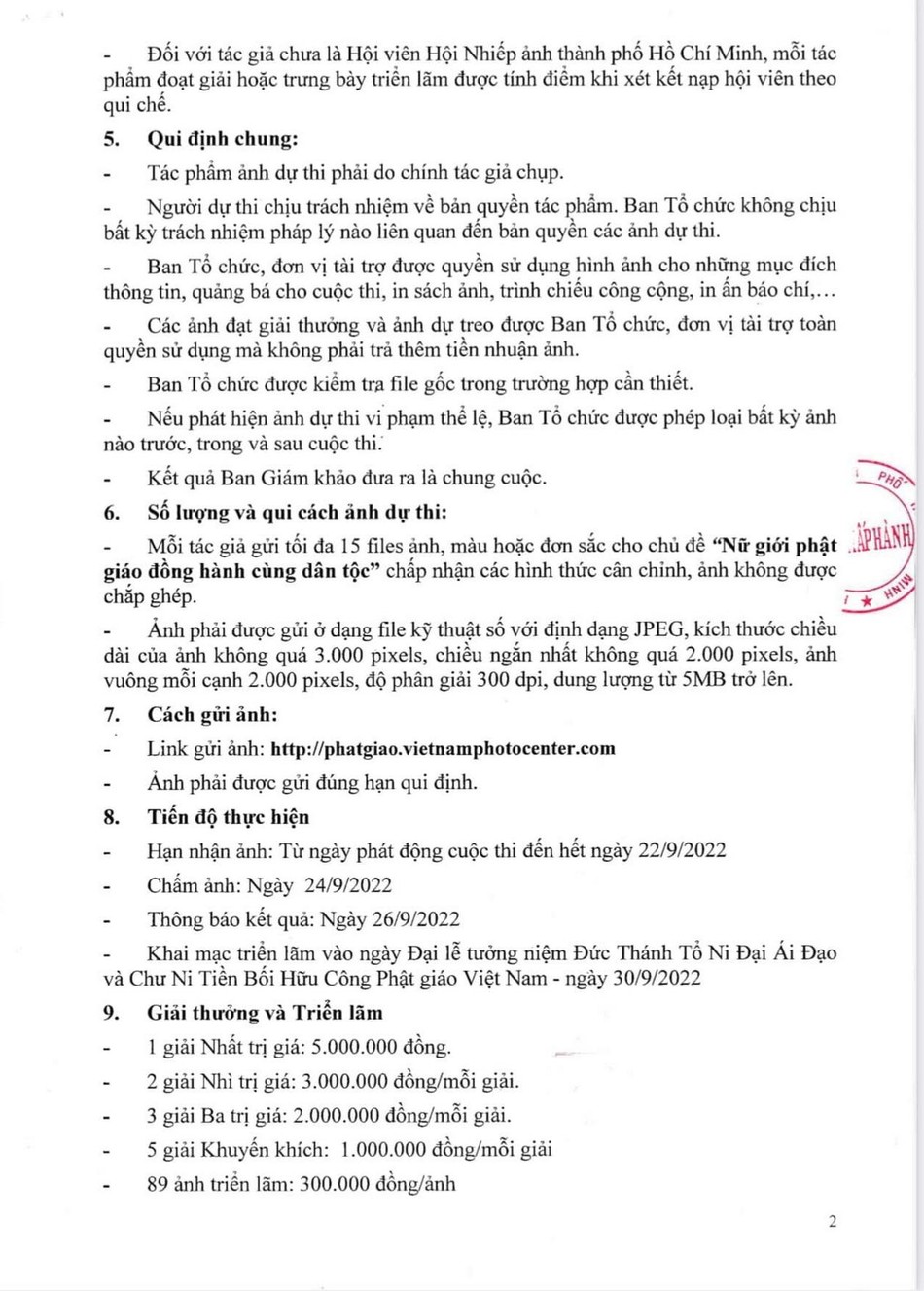 Ban Tổ chức nhận ảnh qua link: http://phatgiao.vietnamphotocenter.com; từ ngày phát động cuộc thi đến hết ngày 22-9-2022; thông báo kết quả vào ngày 26-9-2022.